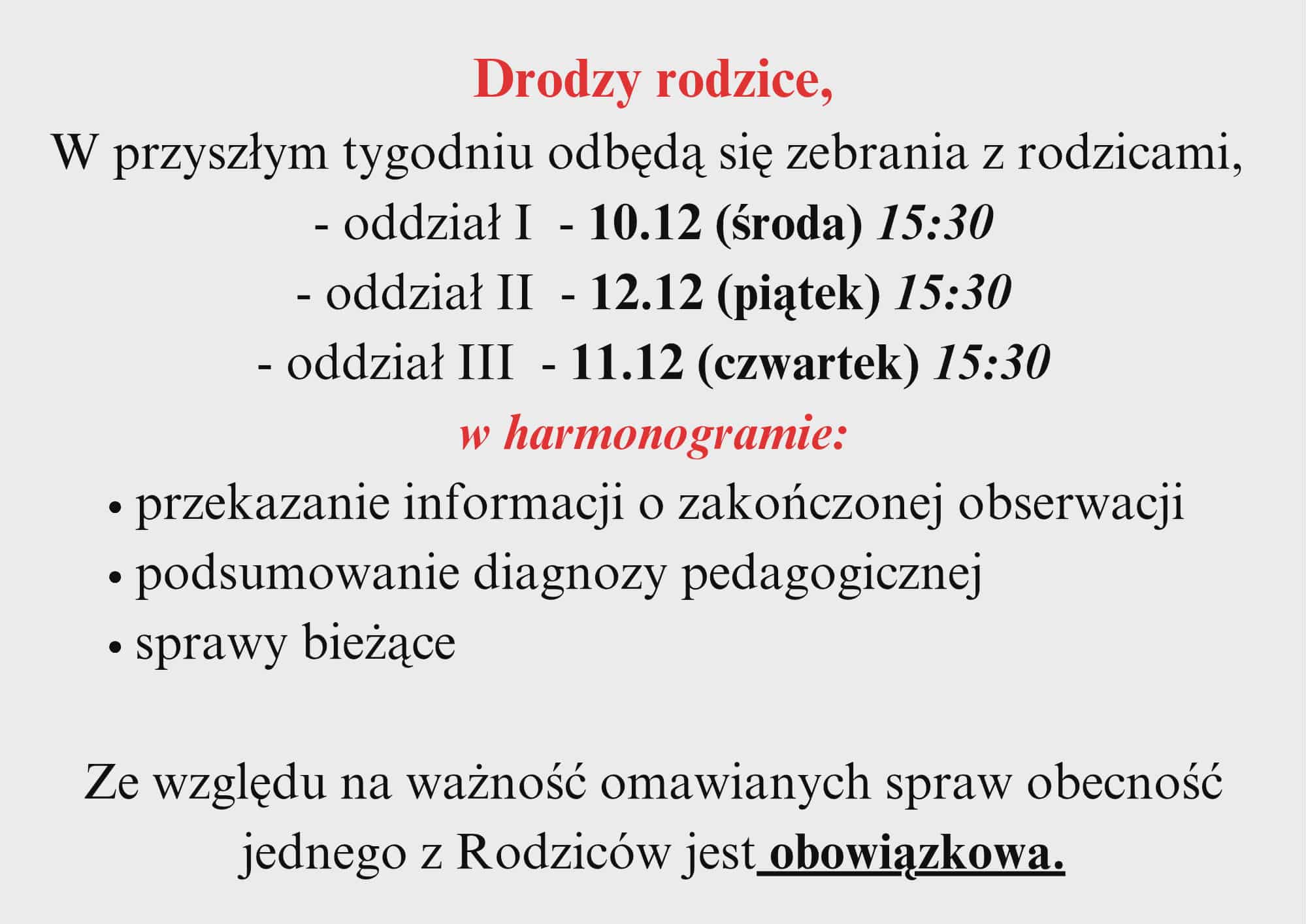 Informujemy, że zebranie dla rodziców dzieci z oddziału II i oddziału III odbędzie się we wtorek 10 września o godz. 15.30.