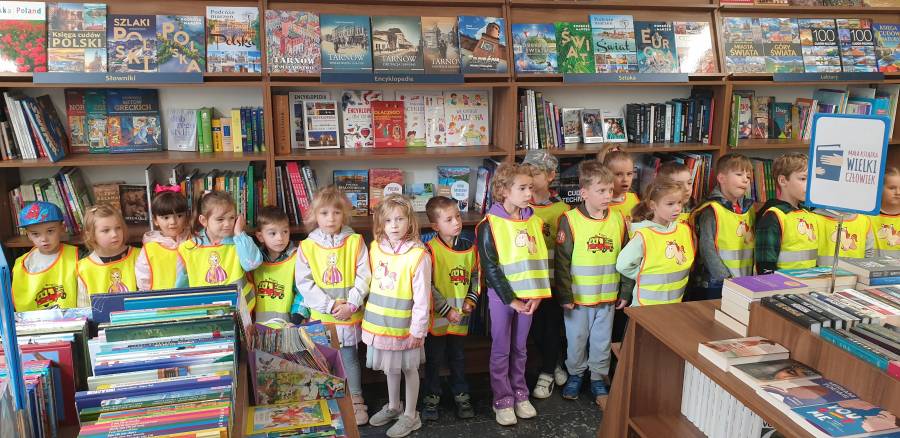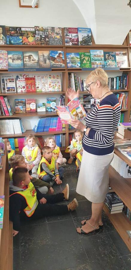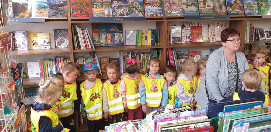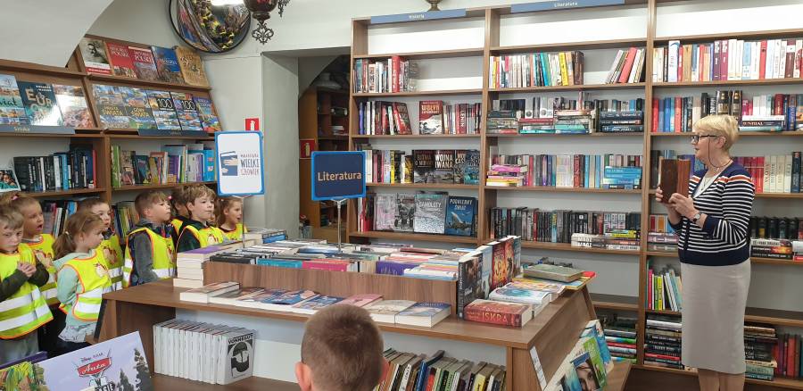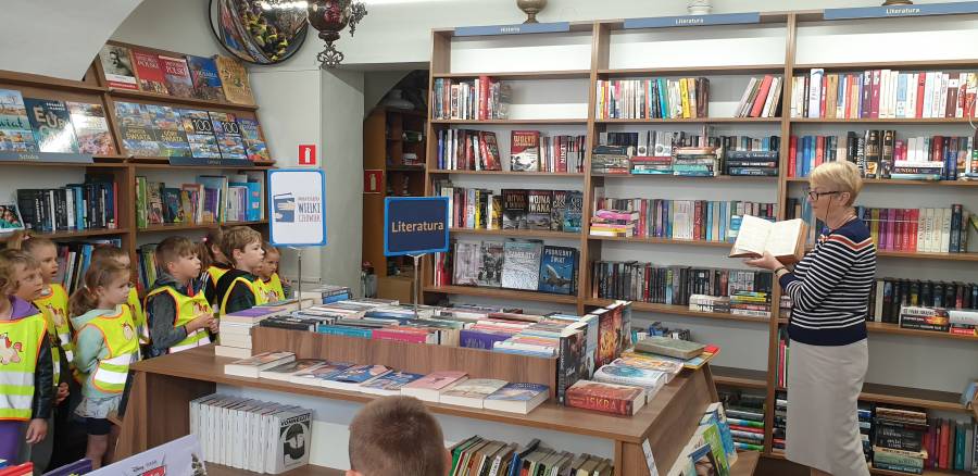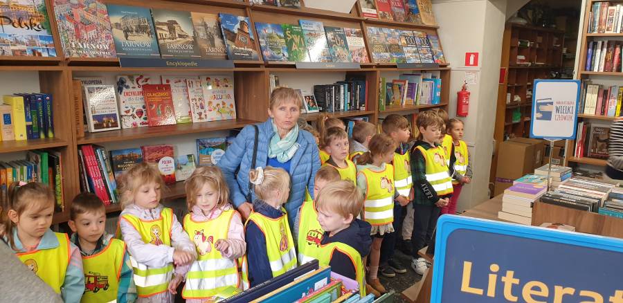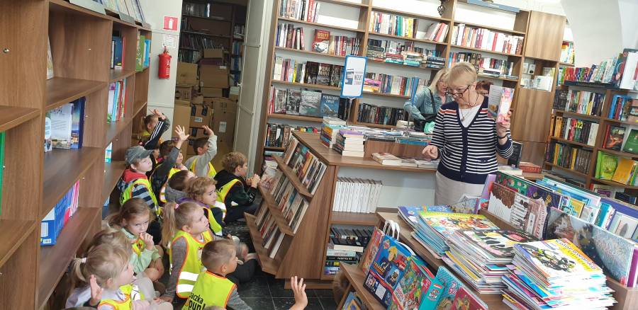 12.09.2022r. Spotkanie w księgarni. Dzieci z oddziału II i III były z wizytą w Księgarni Współczesnej ul. Wałowa. Właścicielka księgarni zapoznała dzieci z miejscem jakim jest księgarnia, jaką pełni funkcję. Opowiadała o różnych rodzajach książek, o tym jak one powstają. Przedszkolaki słuchały czytaną przez księgarza książkę. Na zakończenie spotkania otrzymały książki do przedszkolnej biblioteki oraz pamiątkowe zakładki i naklejki.