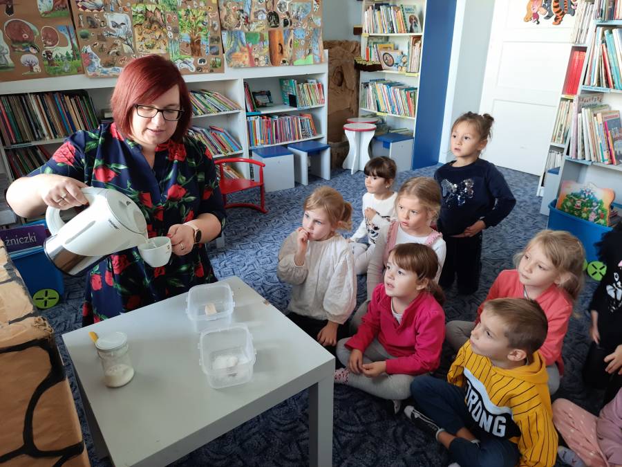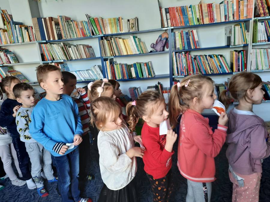 Zajęcia w bibliotece 05.10.2022r. dzieci z oddziału II brały udział w zajęciach w Miejskiej Bibliotece Publicznej im. J. Słowackiego Dział dla Dzieci i Młodzieży. Tematem zajęć była ?Higiena?. Dzieci na podstawie literatury, gier dydaktycznych oraz zabaw utrwaliły sobie wiedzę na temat konieczności dbania o higienę swojego ciała m.in. poprzez mycie zębów, częste mycie rąk szczególnie przed jedzeniem i po powrocie np. z placu zabaw. Dowiedziały się również, dlaczego po zjedzeniu słodyczy koniecznie trzeba umyć zęby. Na podstawie doświadczenia miały możliwość zaobserwowania działania cukru na szybkość rozmnażania się grzybów.