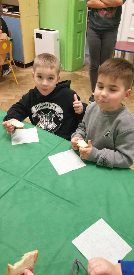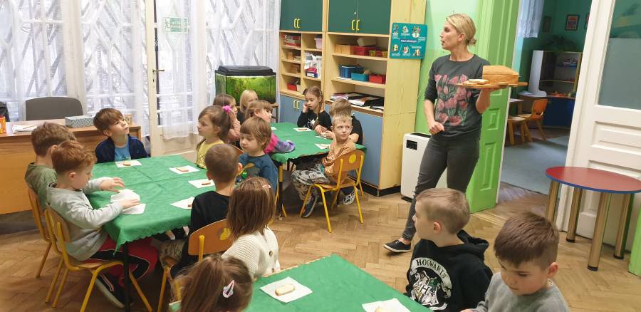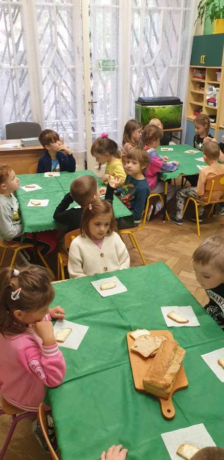 W ramach programu edukacyjnego "Skąd się biorą produkty ekologiczne" z okazji Światowego Dnia Chleba dzieci poznały ziarna zbóż, z których powstaje mąka. Piekły chleb poznając etapy jego wykonania. Wykonały kanapki z różnego rodzaju chleba uświadamiając sobie jak ważne i zdrowe jest spożywanie urozmaiconego pieczywa. Przygotowane przez dzieci kanapki mogli degustować rodzice.