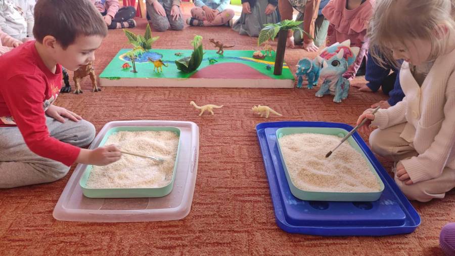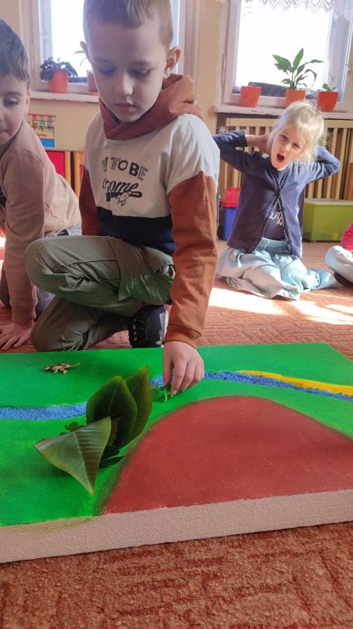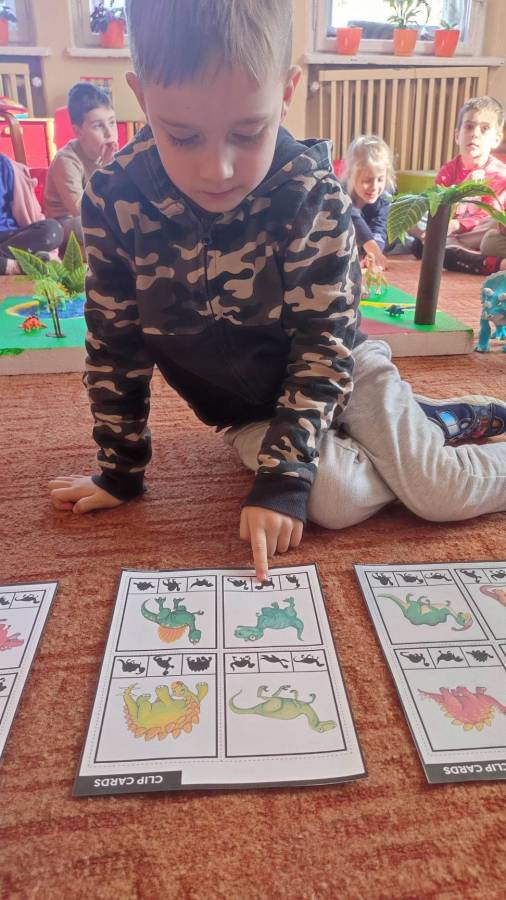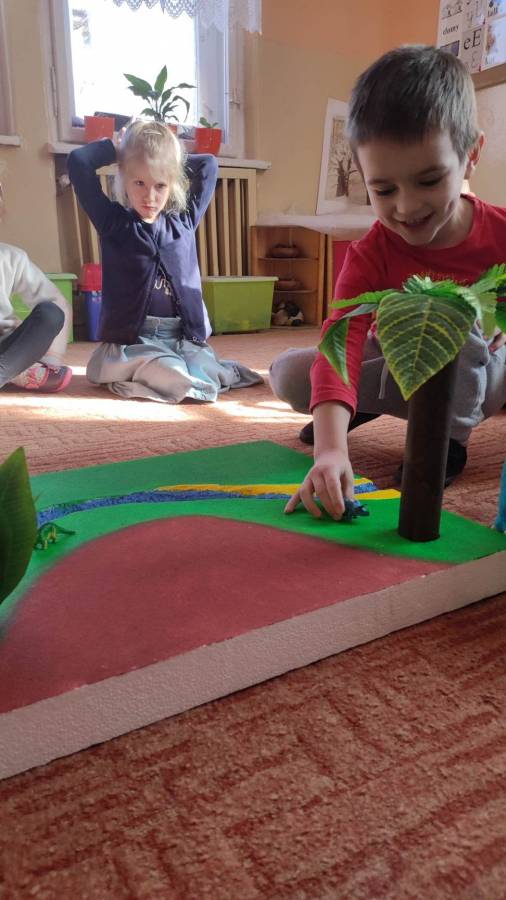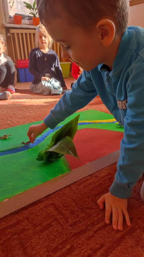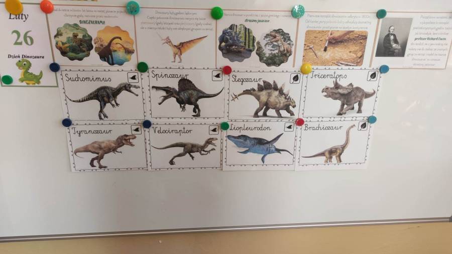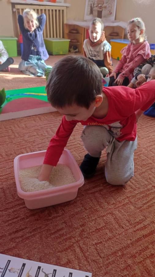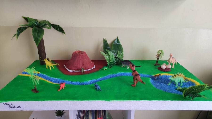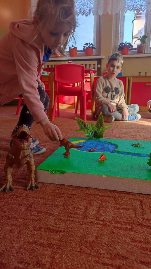 26.02.2023r obchodziliśmy Dzień Dinozaura z tej okazji przedszkolaki poznały historię dinozaurów, dowiedziały się jak wyglądały, czym się żywiły oraz jak wyginęły. Rozmawialiśmy na temat pracy paleontologa i wspólnie dokonaliśmy ,,wykopalisk" dzięki którym zobaczyliśmy jak wyglądają szkielety niektórych dinozaurów. Wspólnie wykonaliśmy wulkan oraz makietę przedstawiającą krainę dinozaurów.