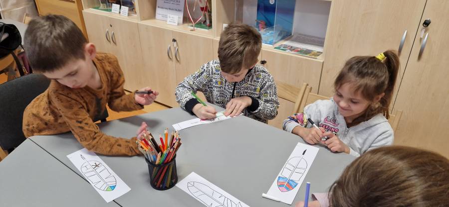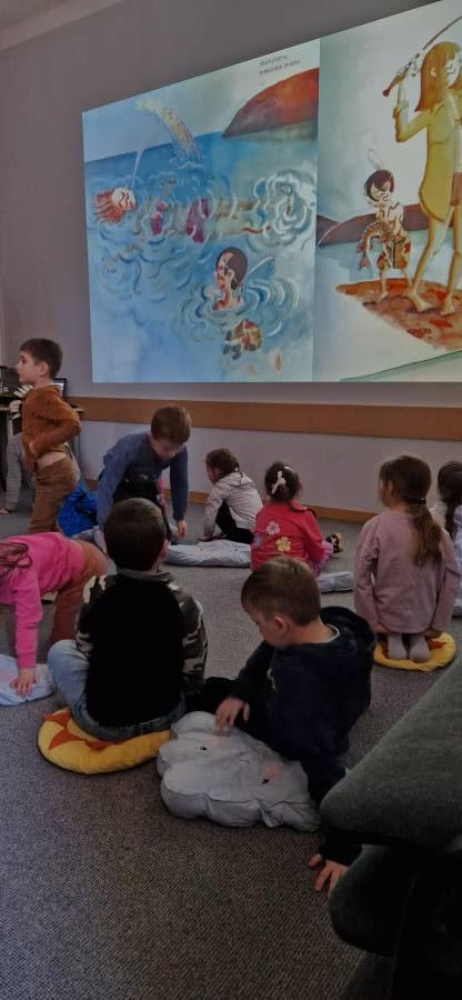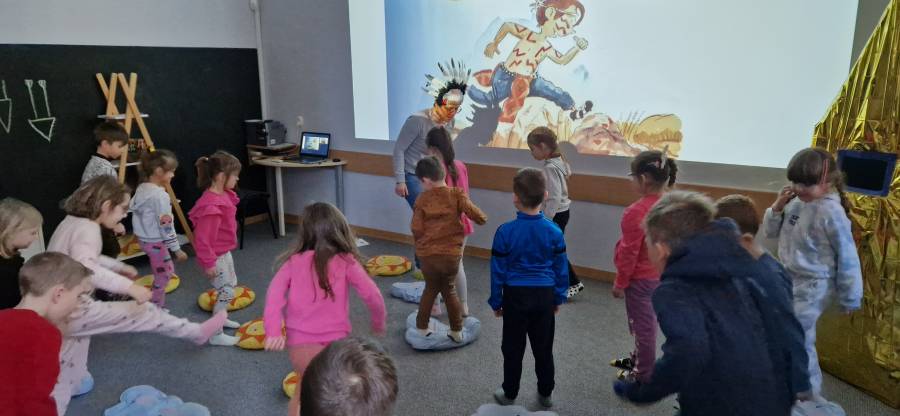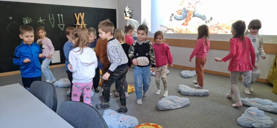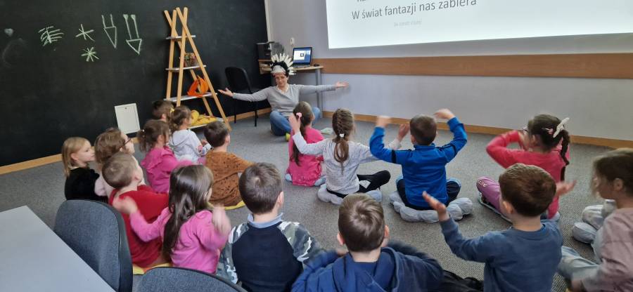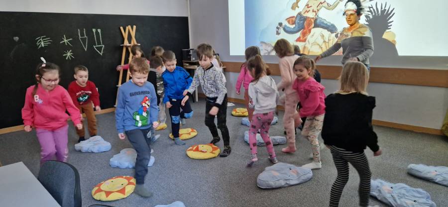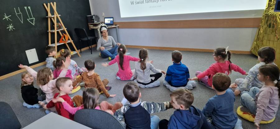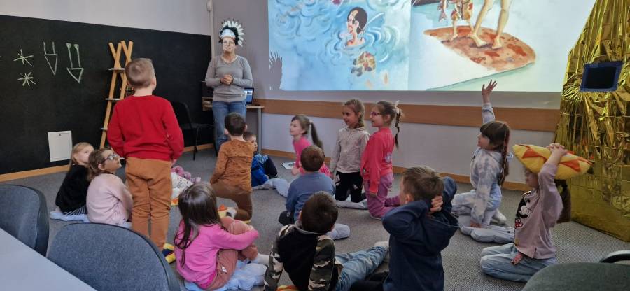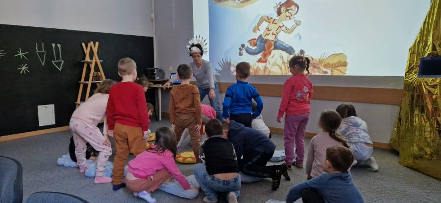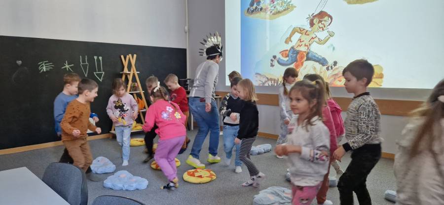 Dnia 29.03.2023r dzieci z oddziału III uczestniczyły w zajęciach zorganizowanych w Bibliotece Pedagogicznej pt,, Jak mama została indianką" - czytanie wrażeniowe metodą M. Swędowskiej .