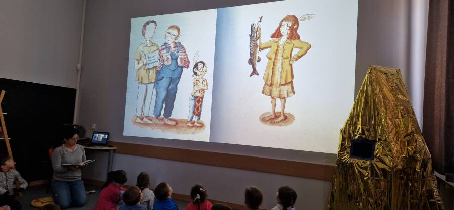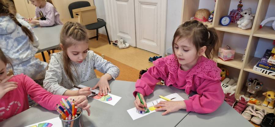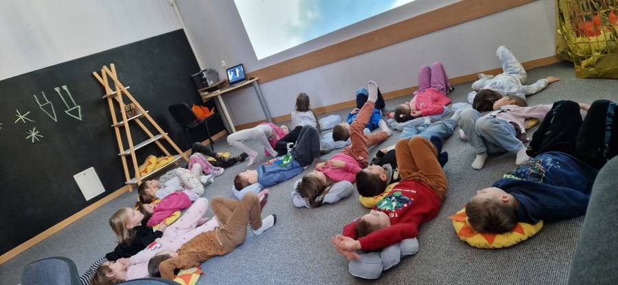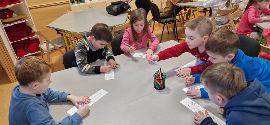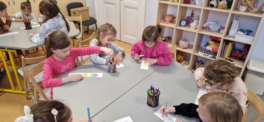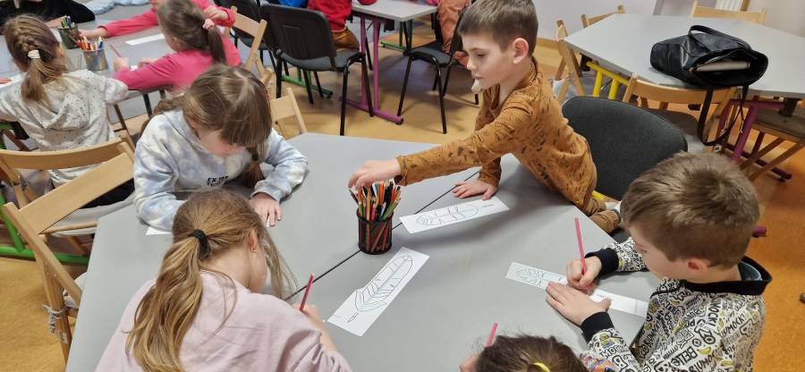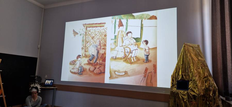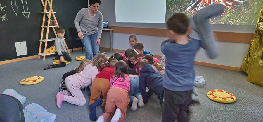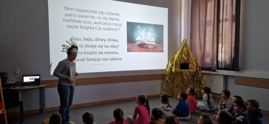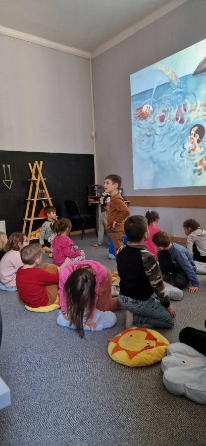 Dnia 29.03.2023r dzieci z oddziału III uczestniczyły w zajęciach zorganizowanych w Bibliotece Pedagogicznej pt,, Jak mama została indianką" - czytanie wrażeniowe metodą M. Swędowskiej .