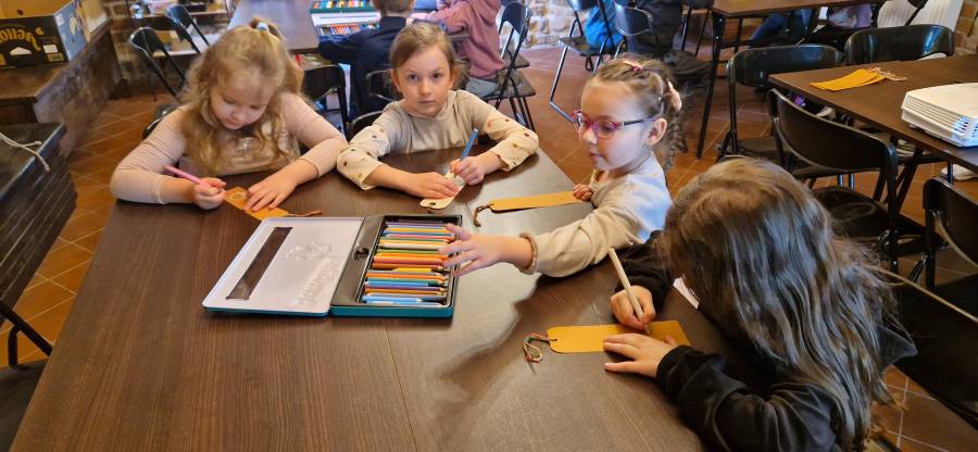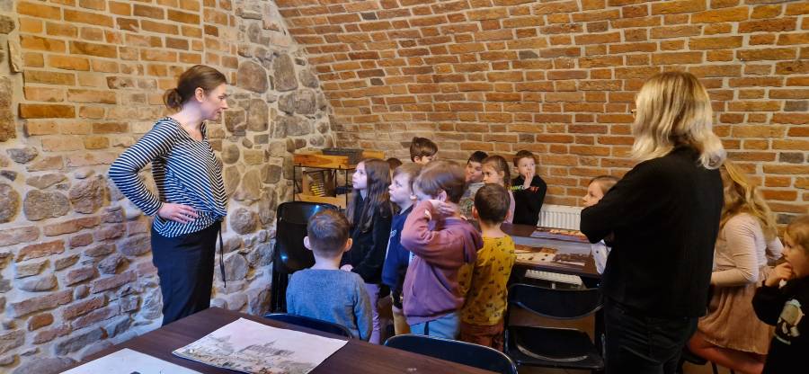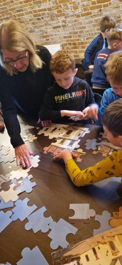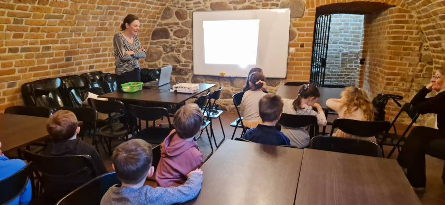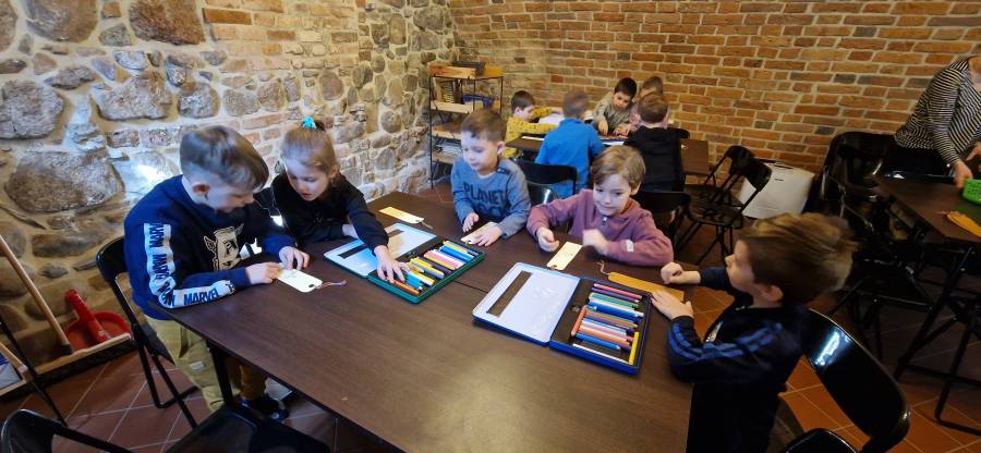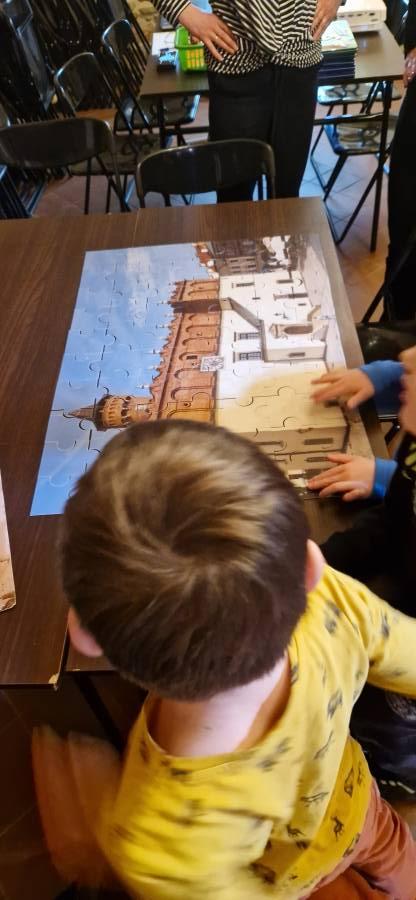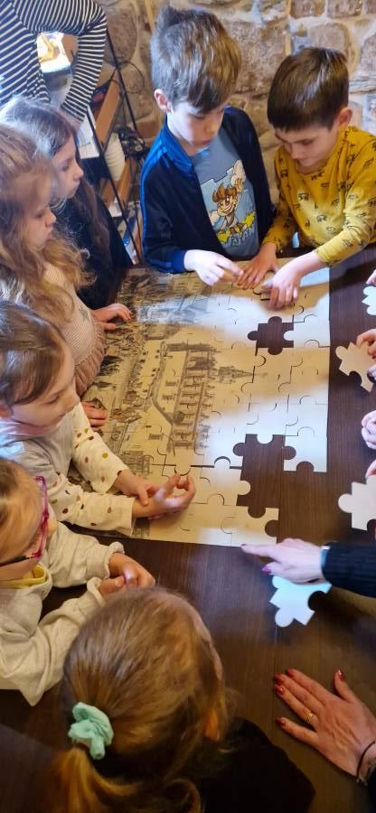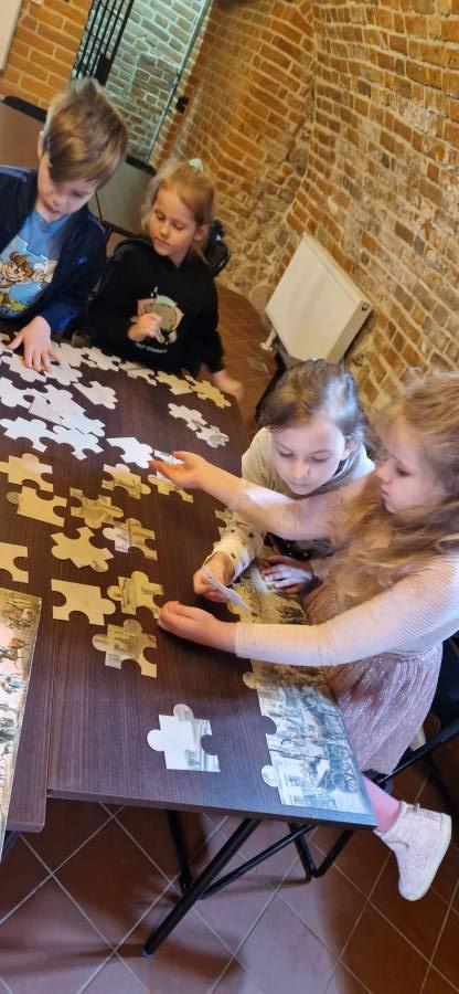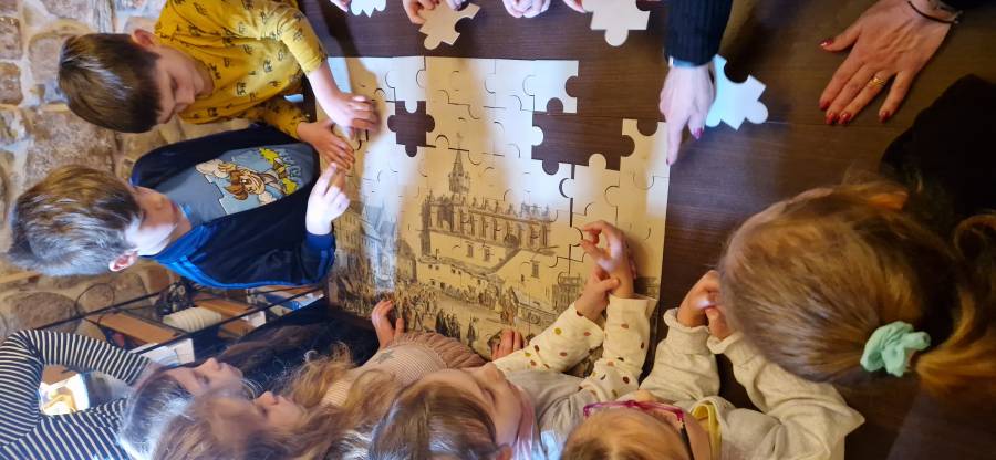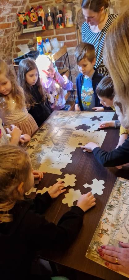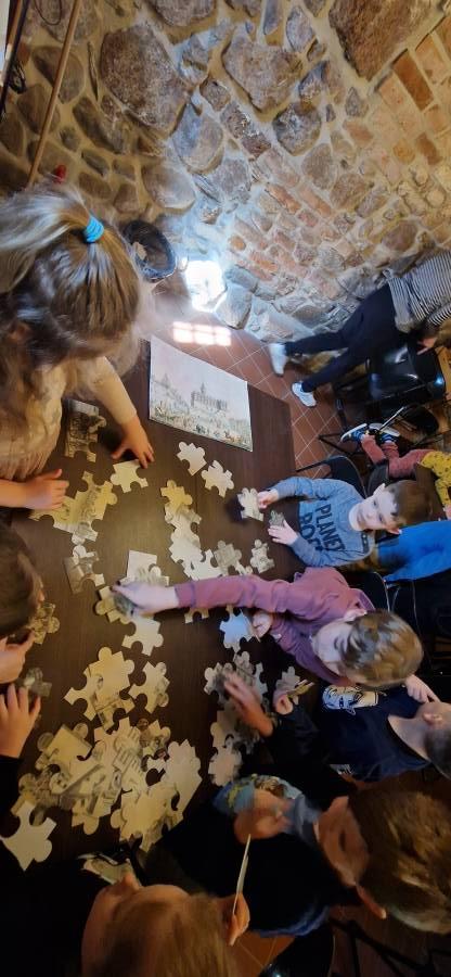 Historia Tarnowa i Ratusza - na ostatnich zajęciach, które odbyły się dnia 11.04.2023r w Sali edukacyjnej Ratusza dzieci obejrzały prezentację multimedialną na której mogły zobaczyć, jak wyglądał zamek, po którym dziś zostały tylko ruiny, jak kiedyś wyglądał Tarnów i dowiedzieć się kto go założył. Ostatnie zajęcia były okazją do świetnej zabawy przy konkurencji w układaniu puzzli. Przedszkolaki z oddziału III wykonały także pamiątkowe zakładki do książki.