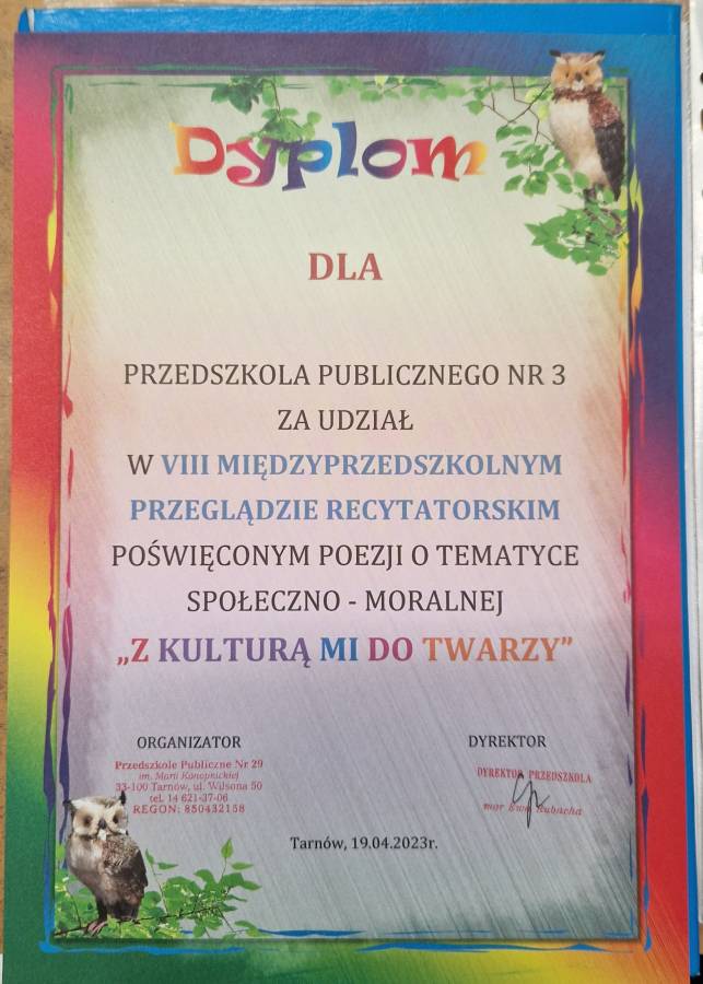 Dziewczynki Zuzia i Ania z oddziału lll wzięły udział w Vlll Międzyprzedszkolnym Przeglądzie Recytatorskim ,,Z kulturą mi do twarzy" organizowanym przez Przedszkole Publiczne nr.29 w Tarnowie. Uczestnicy otrzymali nagrody książkowe,wspólnie się bawili ,na uczestników czekał również słodki poczęstunek.