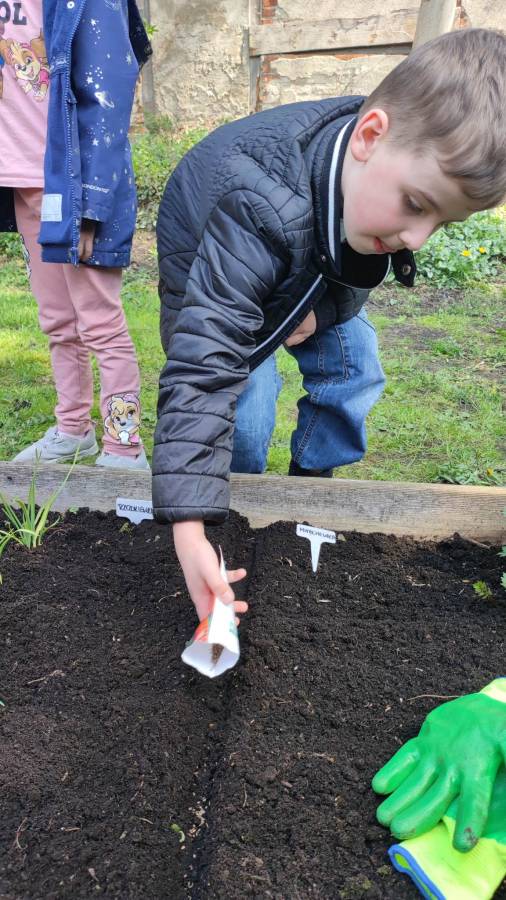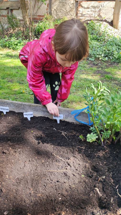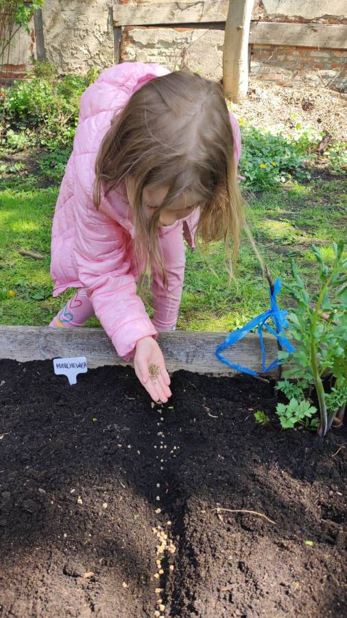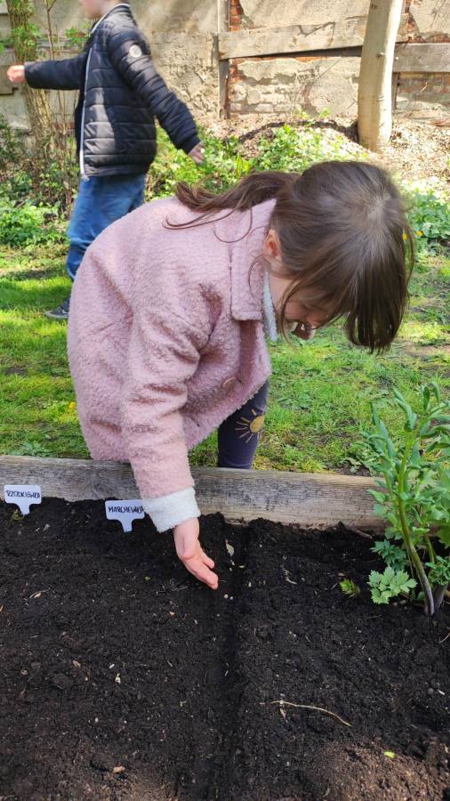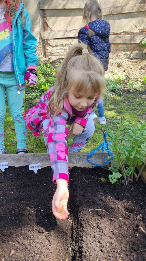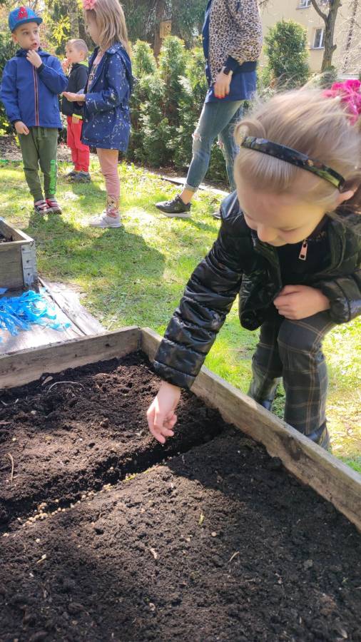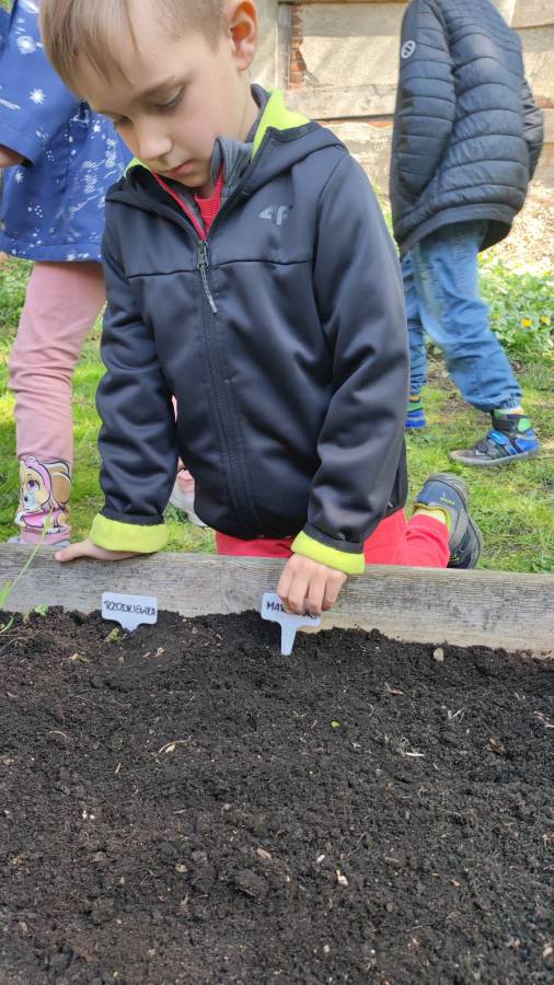 Korzystając z ładnej pogody dzieci z oddziału II wybrały się do przedszkolnego ogródka i zasiały marchew, buraki i rzodkiewkę.