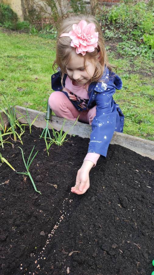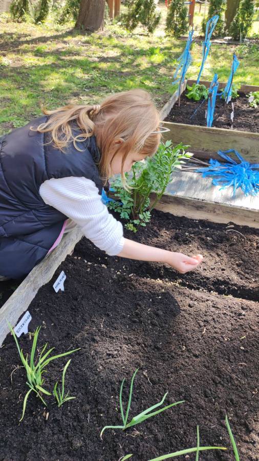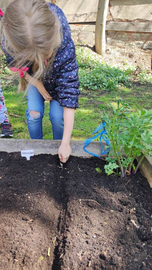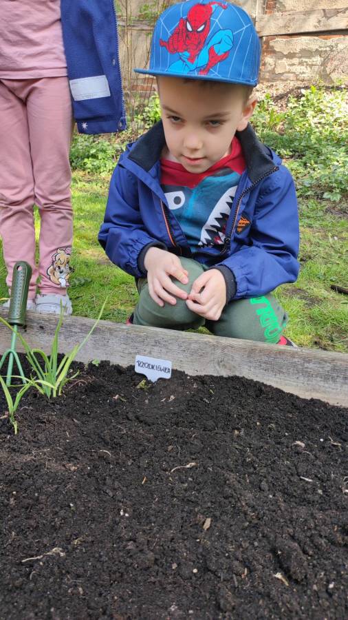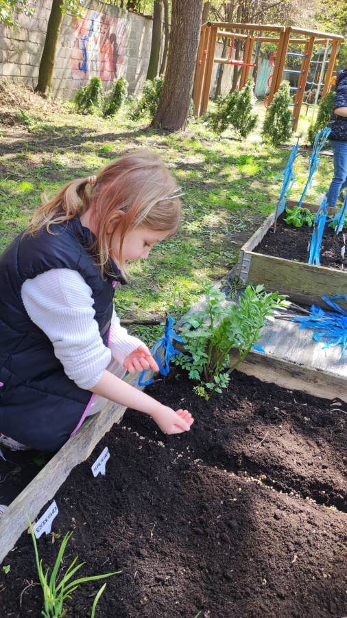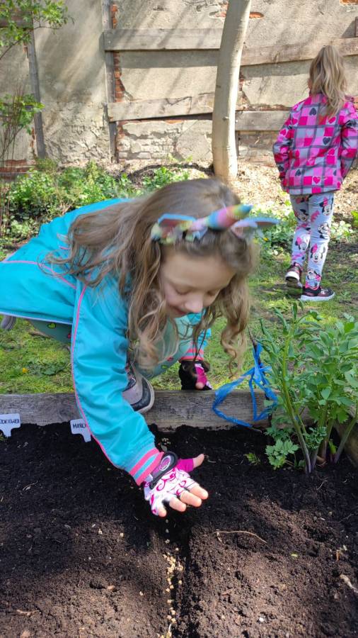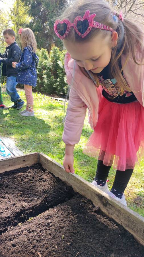 Korzystając z ładnej pogody dzieci z oddziału II wybrały się do przedszkolnego ogródka i zasiały marchew, buraki i rzodkiewkę.
