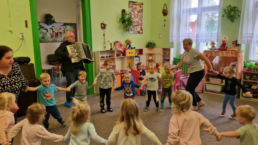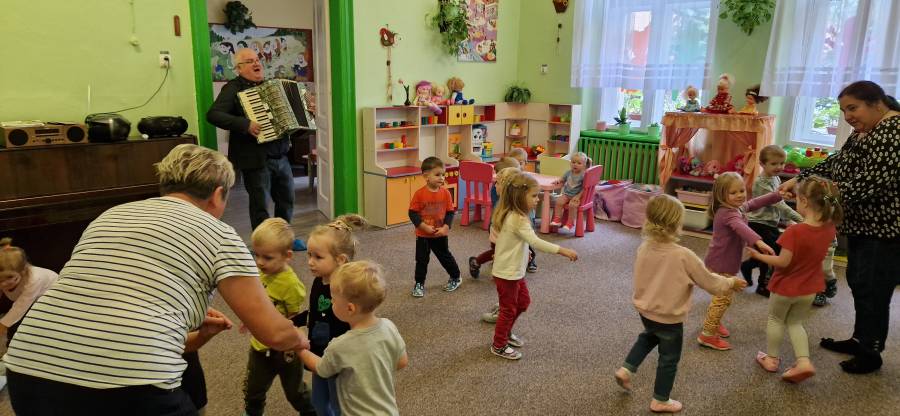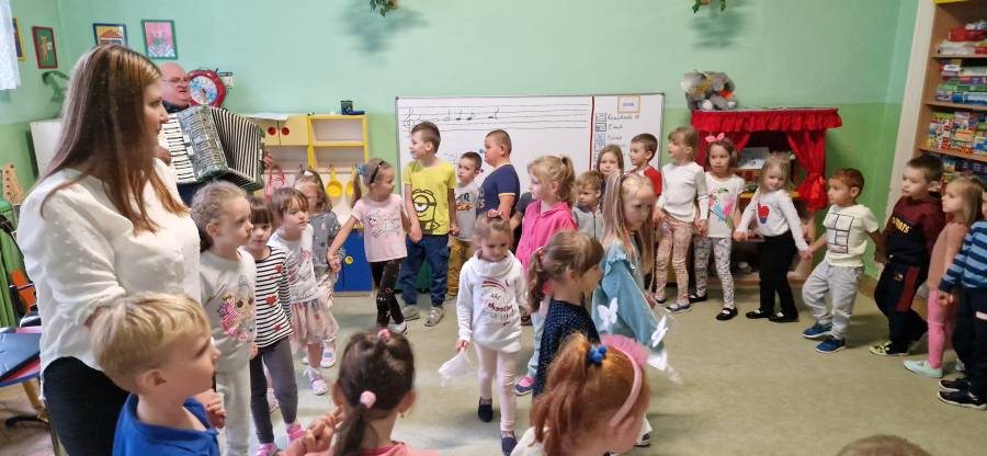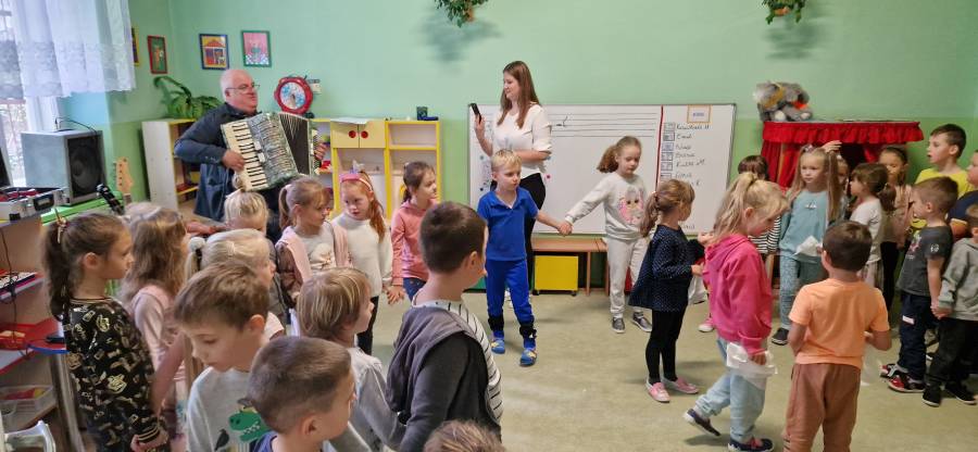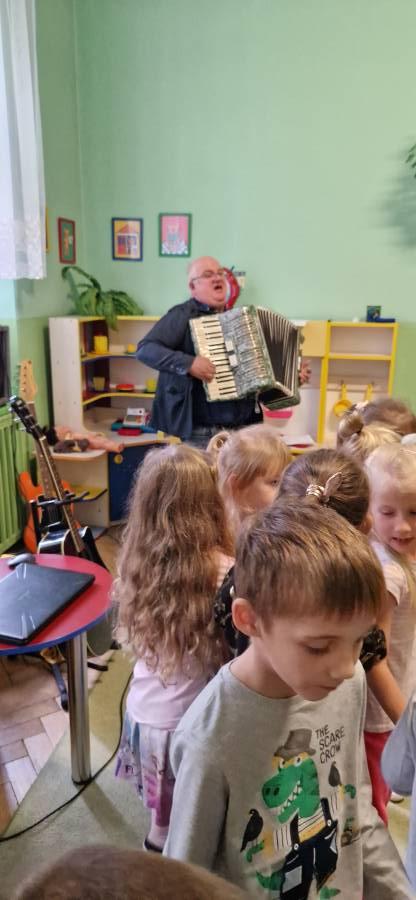 02.10.2023.10.2023 r. w naszym przedszkolu odbył się dzień muzyki. Z tej okazji zaprosiliśmy do nas gościa - dzieci poznały zawód muzyka, czym się zajmuje. Poznały wartości nut oraz brzmienie instrumentów: fletu, akordeonu i gitar- akustycznej, elektrycznej i basowej a także wspólnie tańczyli do piosenki "mam chusteczkę haftowaną" wykonywaną na akordeonie.