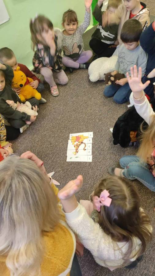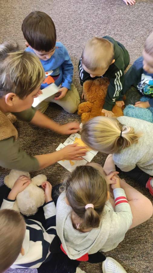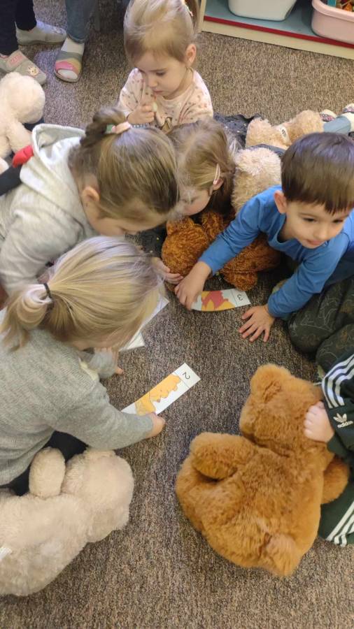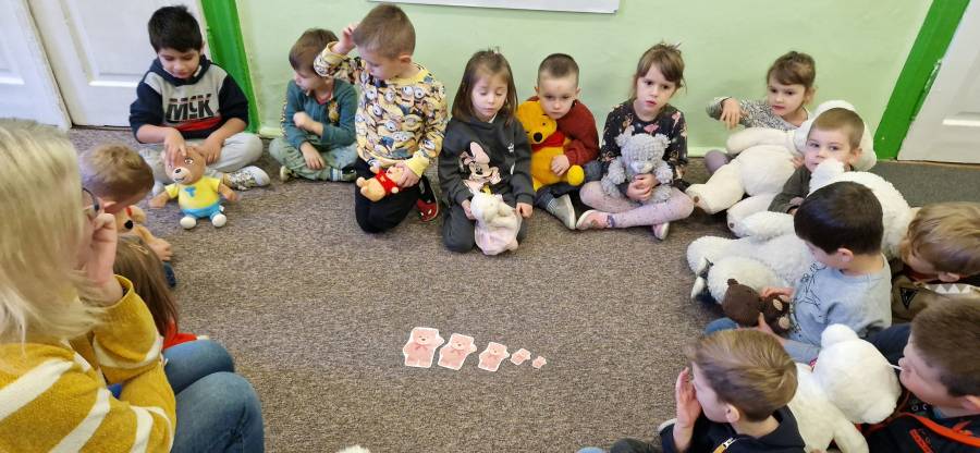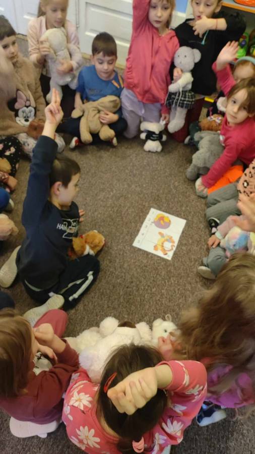 , tego dnia dzieci przyszły do przedszkola wraz ze swoimi pluszowymi przyjaciółmi. Podczas zajęć dzieci poznały historię misia i skąd pochodzi, układały puzzle, segregowały misie pod względem wielkości. Na koniec wszyscy zatańczyliśmy ze swoimi przytulankami wokół naszego przedszkolnego Misia Uszatka.