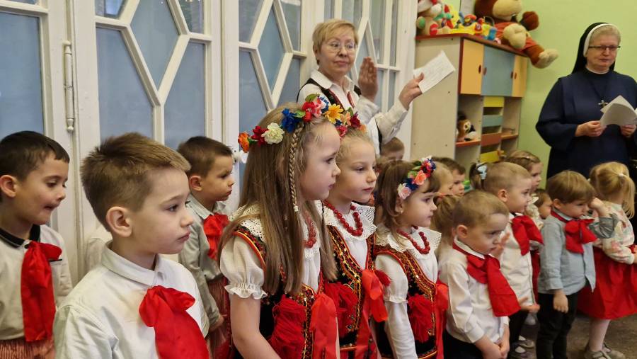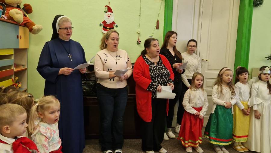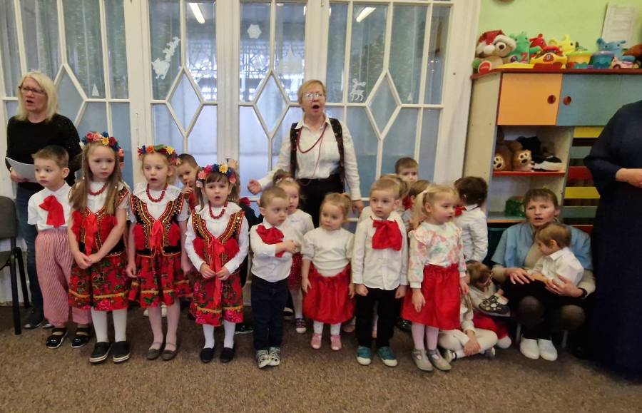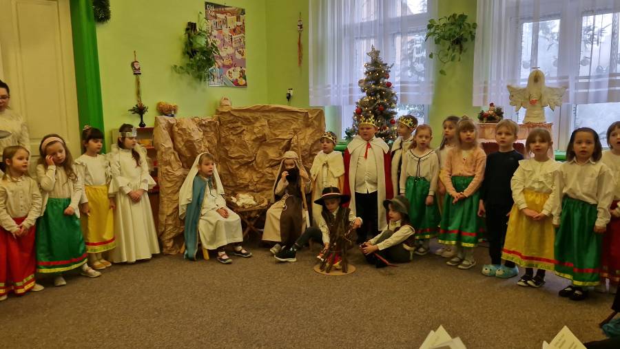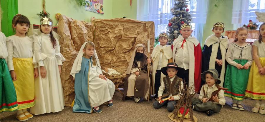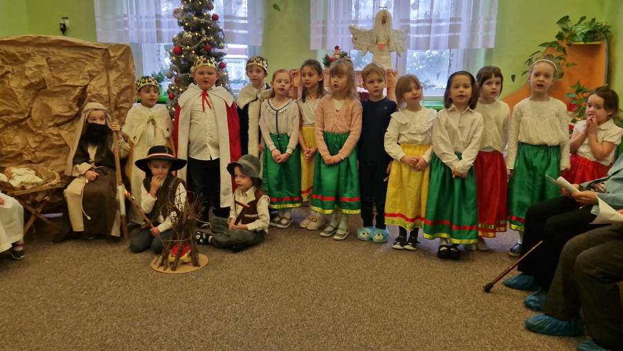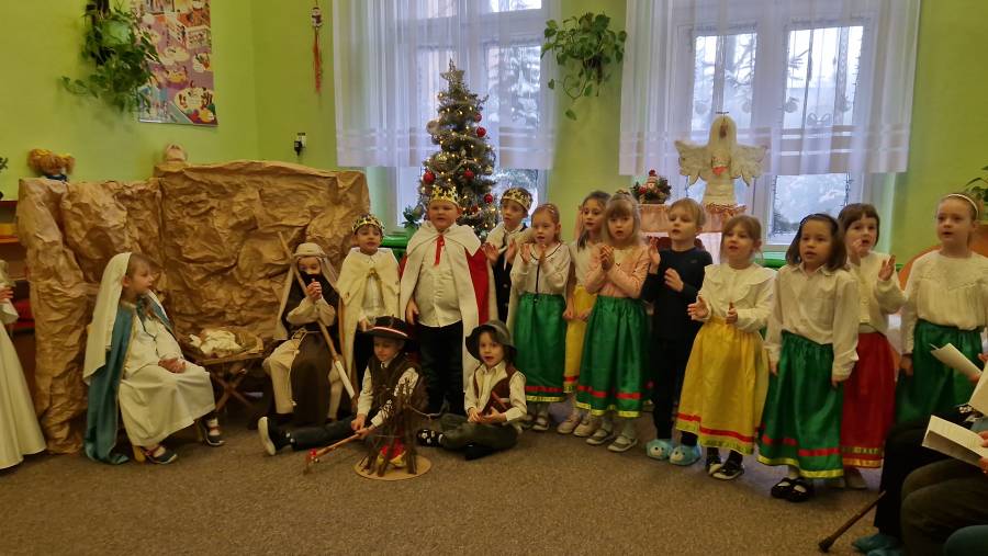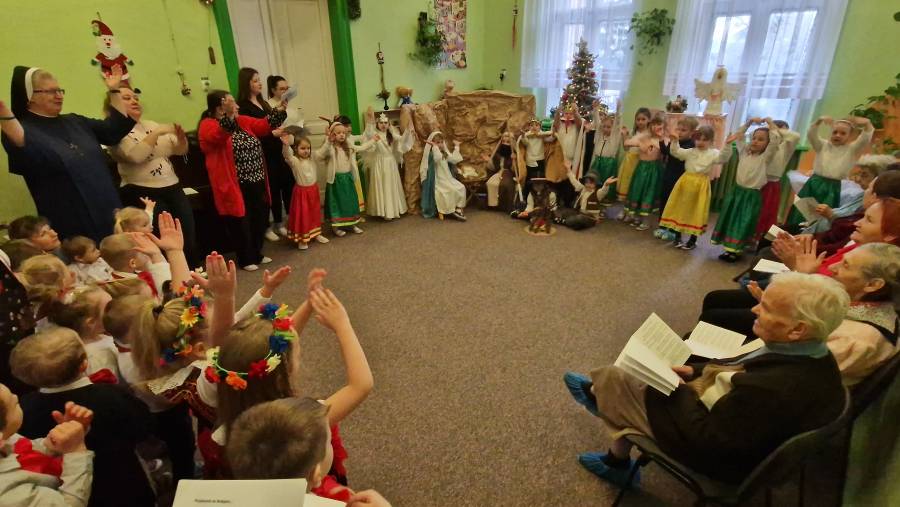 11.01.2024r w naszym przedszkolu odbyło się wspólne kolędowanie " Kolędujmy Małemu". Do wspólnego kolędowania z przedszkolakami zaproszeni zostali goście ze Środowiskowego Domu Samopomocy ? Zielona przystań?. Śpiewanie kolęd i pastorałek to jeden z najpiękniejszych polskich zwyczajów, który zbliża ludzi, buduje między nimi więź.