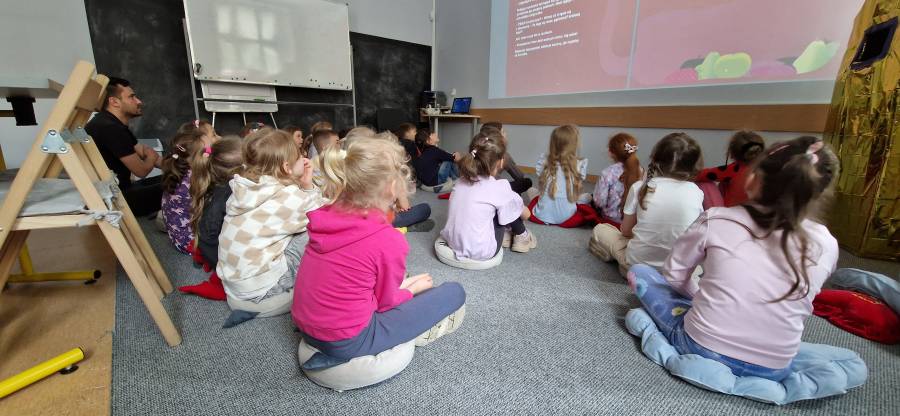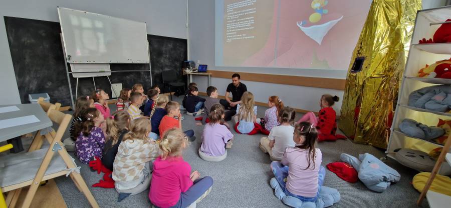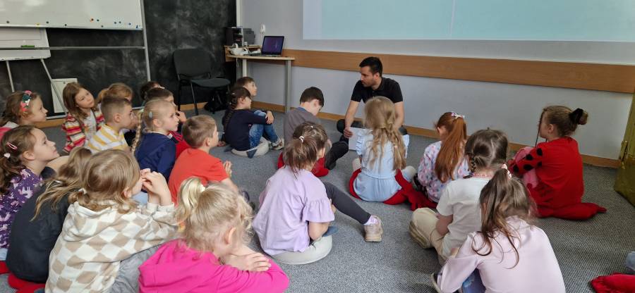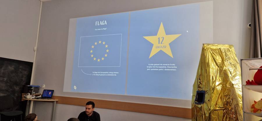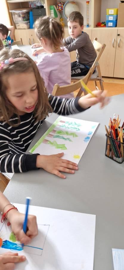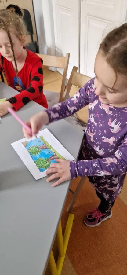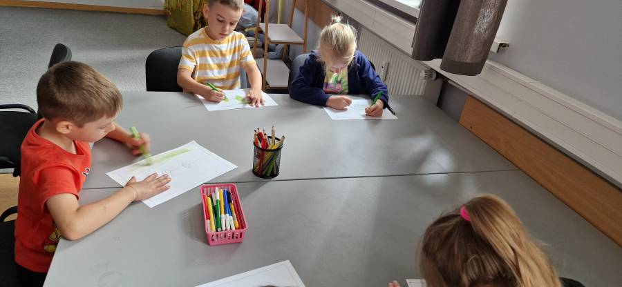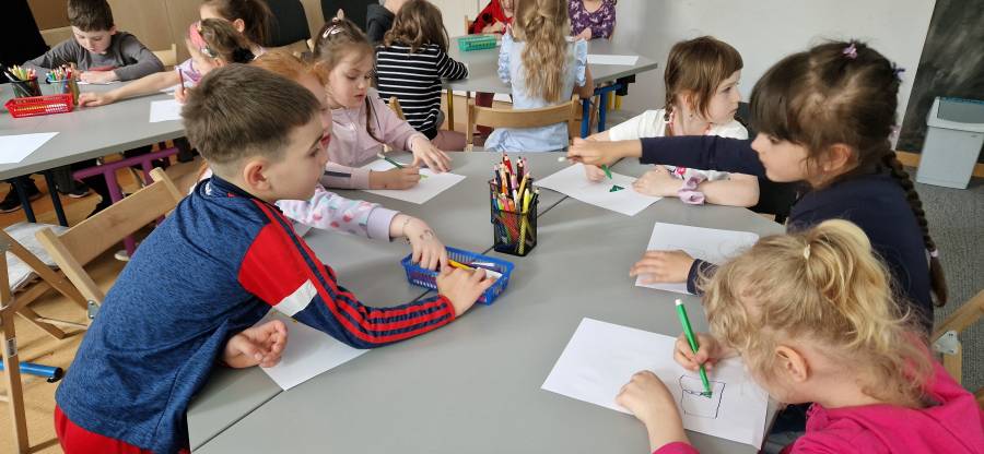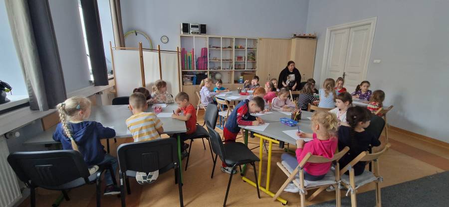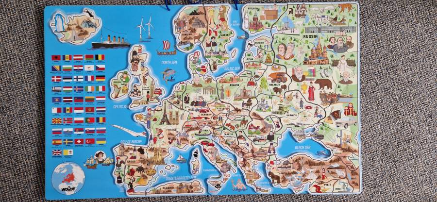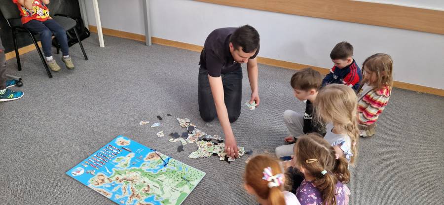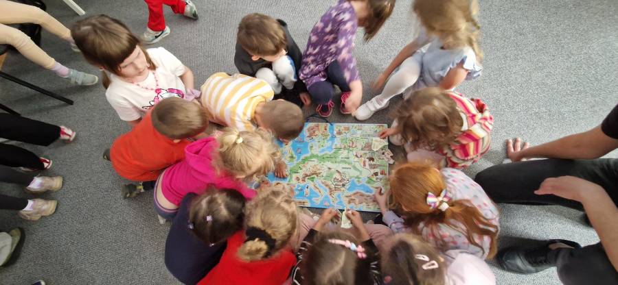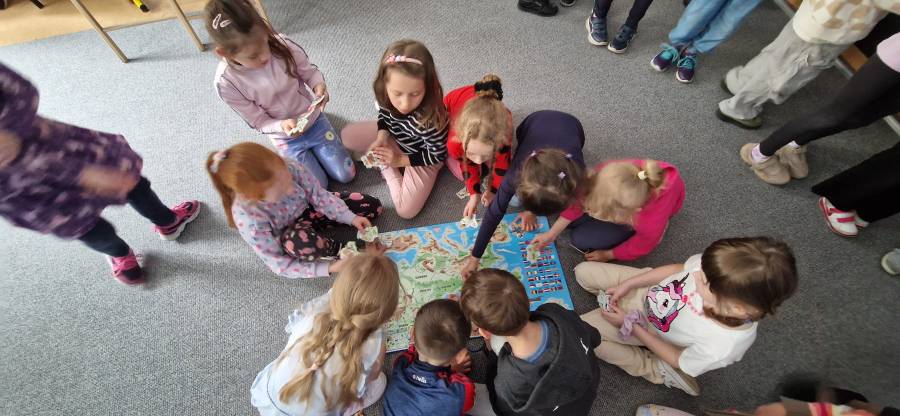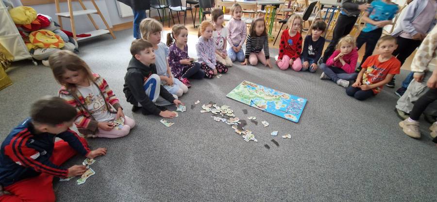 7.05.2024 dzieci z oddziału III uczestniczyły w zajęciach w Bibliotece Pedagogicznej. Temat zajęć " Wycieczka po Europie. Z czego słyną europejskie państwa". Zajęcia prowadzone były z wykorzystaniem magnetycznej mapy Europy. Przedszkolaki dopasowywały odpowiednie puzzle poznając położenie poszczególnych krajów, flagi a także rzeczy, z których słyną państwa europejskie. Wykonały prace plastyczne projektując flagę Leśnej Unii.