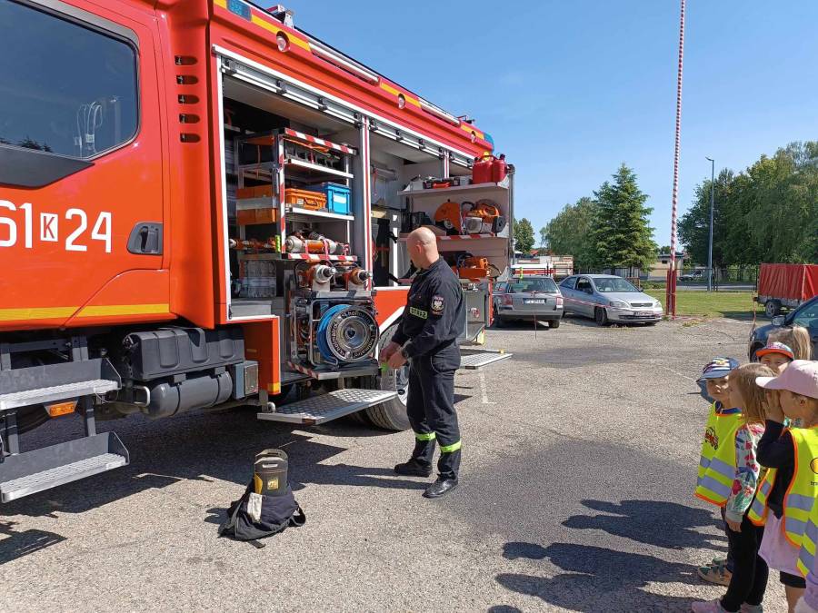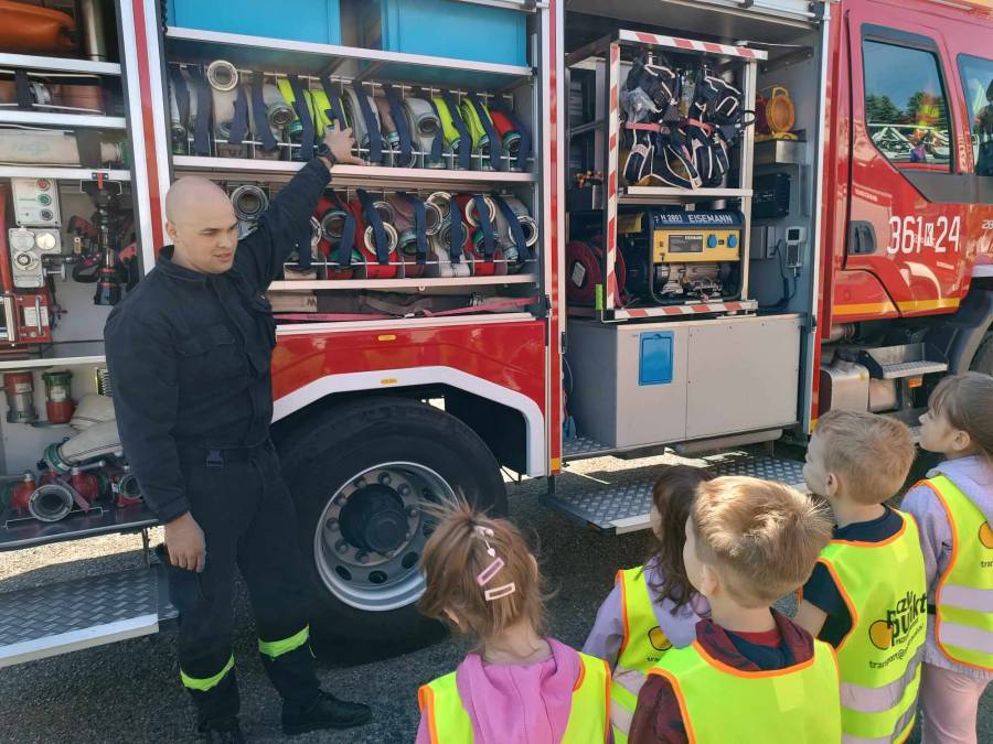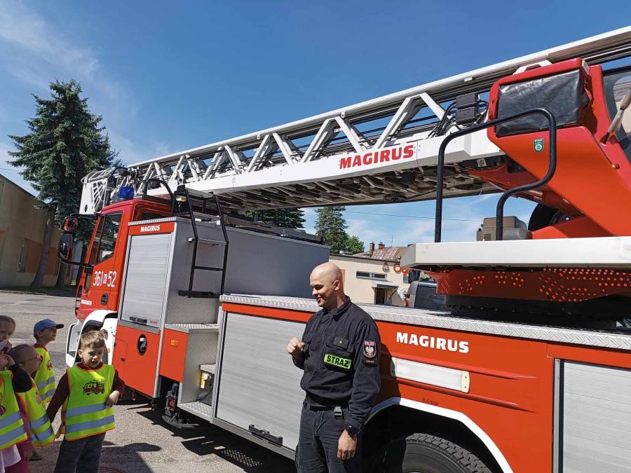 Dnia 17.05.2024r. dzieci z oddziału ll udały się na wycieczkę do Państwowej Straży Pożarnej. Celem wycieczki było poznanie pracy strażaków, zapoznanie się z wyposażeniem wozów strażackich, oraz kształtowanie właściwych zasad zachowania się podczas pożaru.