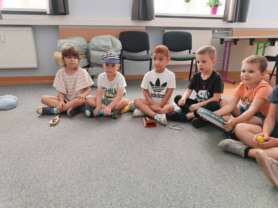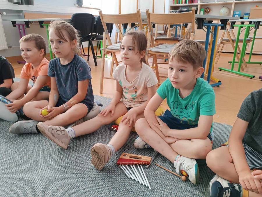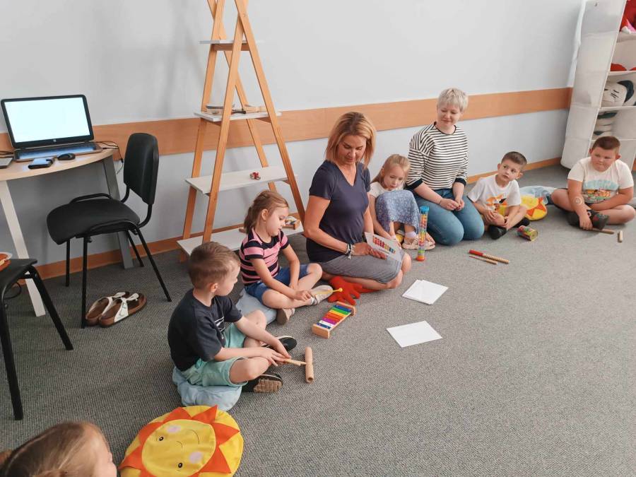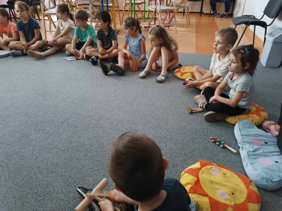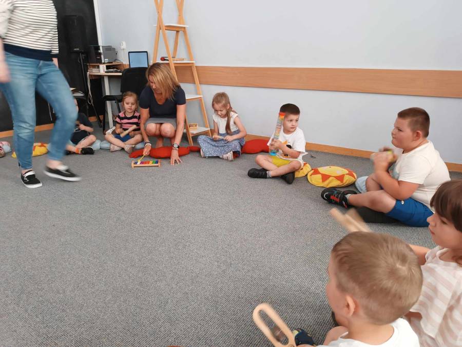 Dnia 6.06.2024r .dzieci z oddziału ll udały się do Biblioteki Pedagogicznej na kolejne zajęcia pt.,,Muzyczne warsztaty terapeutyczne - z dźwiękiem wśród książek ".
