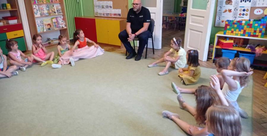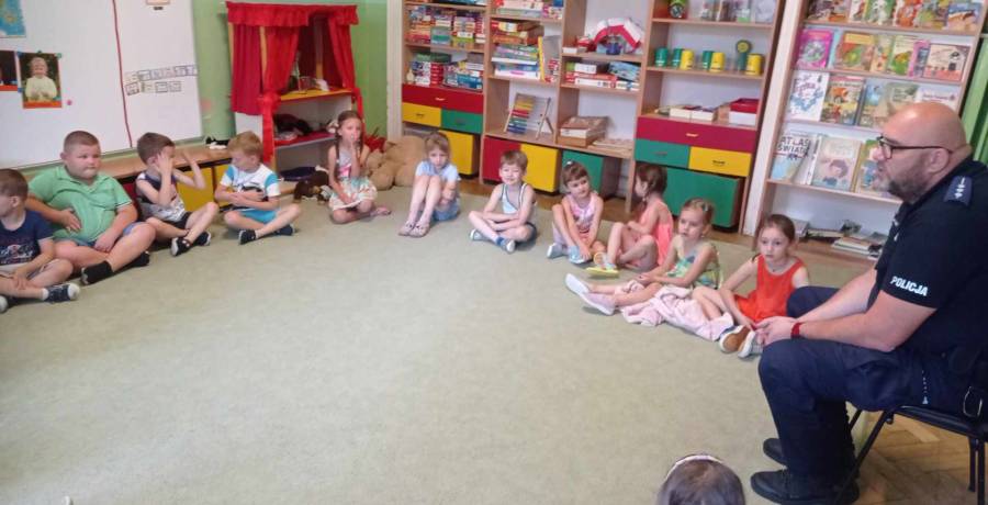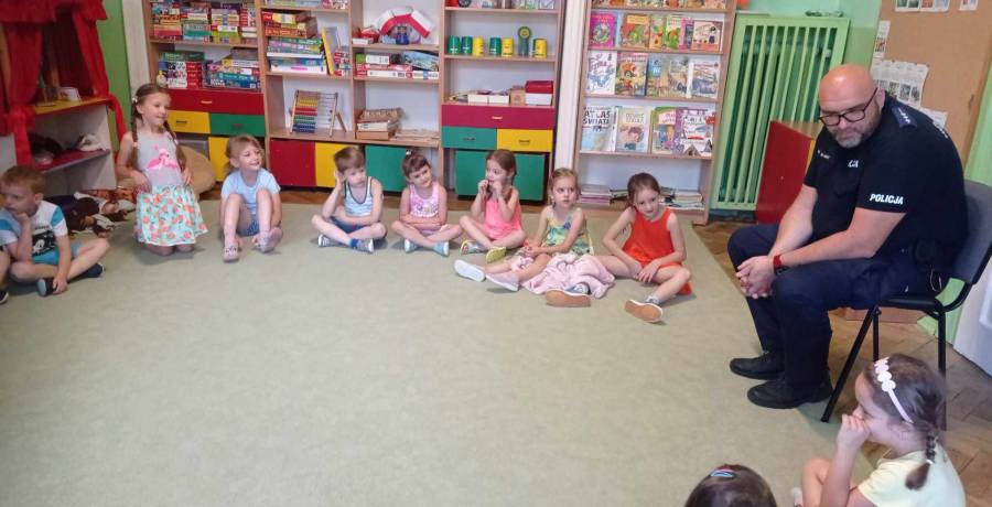 Nasze przedszkole odwiedził Pan Policjant, aby przypomnieć dzieciom zasady bezpiecznego zachowania się podczas wakacyjnego wypoczynku. Przypomnieliśmy sobie numery alarmowe.Utrwalilismy zasady poruszania się po drodze, bezpiecznego zachowania nad wodą, w górach, zasady ograniczonego zaufania w stosunku do obcych oraz zwierząt.