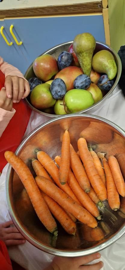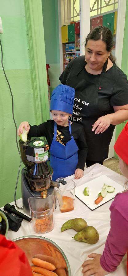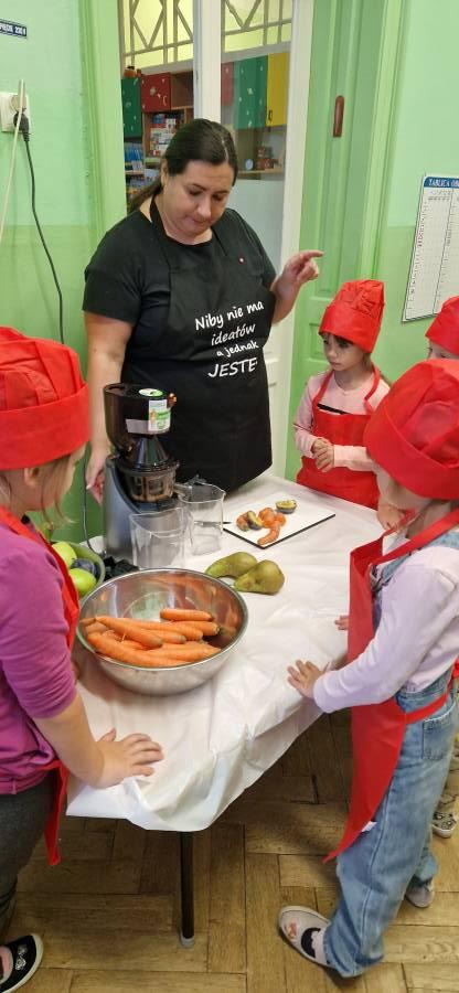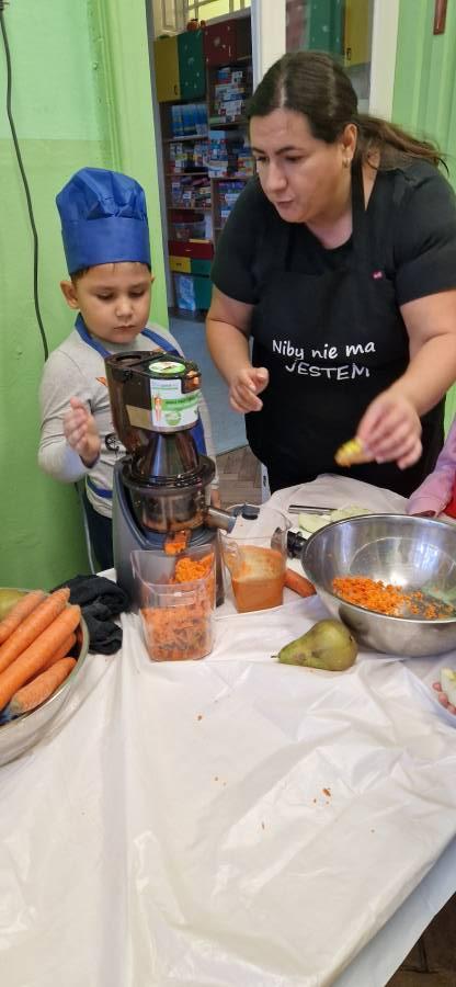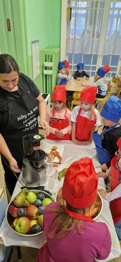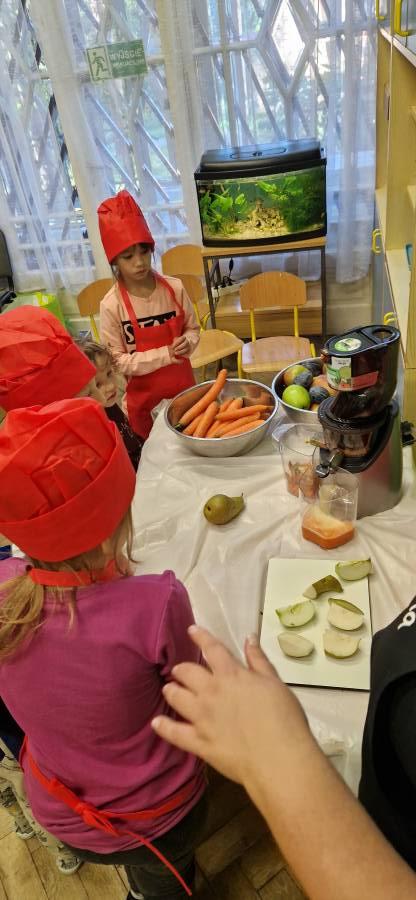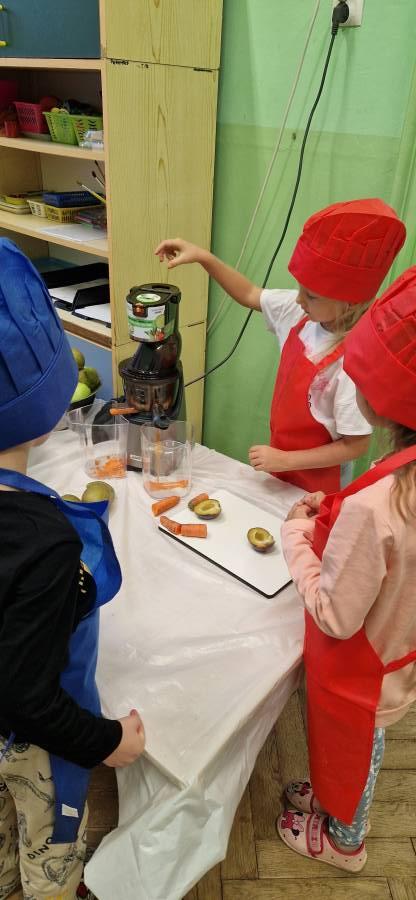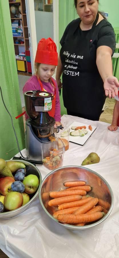 Przedszkolaki z naszego przedszkola bardzo dobrze wiedzą, że aby być zdrowym należy się dobrze odżywiać, wiedzą też, że najwięcej witamin mają owoce i warzywa, dlatego z owoców i warzyw przygotowywały pyszne soki. Soki to nie tylko doskonałe źródło witamin i cennych składników, ale zdrowa alternatywa dla słodyczy. Przekonaliśmy się o tym podczas robienia i picia soków przez dzieci w naszym przedszkolu. Jednak zanim przystąpiliśmy do pracy, przedszkolaki zapoznały się z urządzeniem do robienia soku ? wyciskarką wolnoobrotową jej działaniem oraz utrwaliły podstawowe zasady higieny i bezpieczeństwa. Po skończonej pracy delektowały się pysznym sokiem.