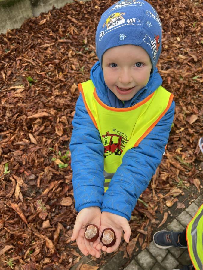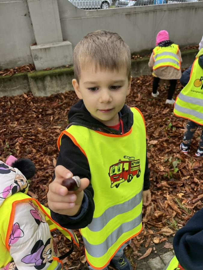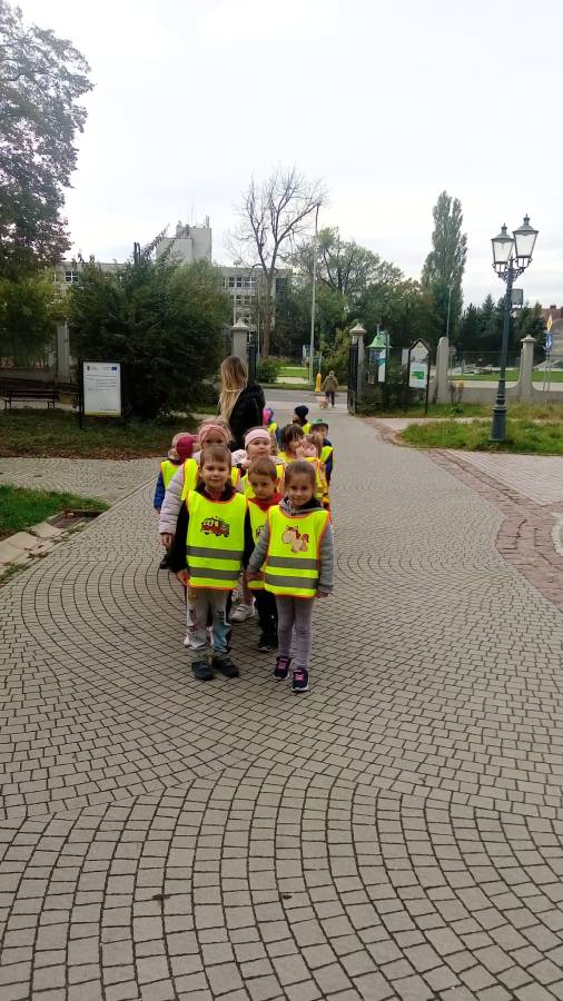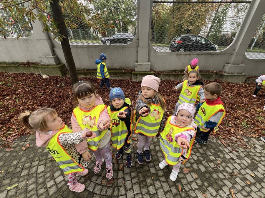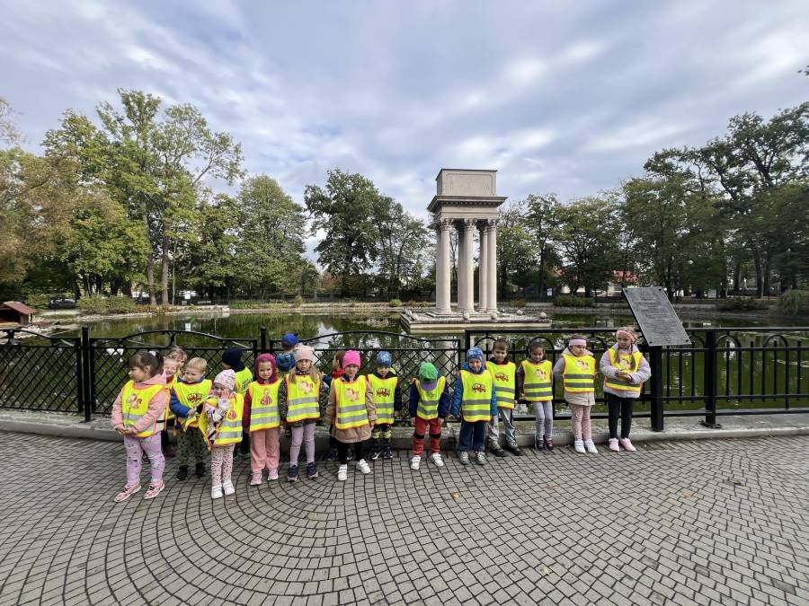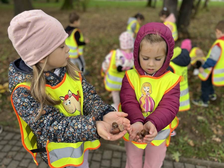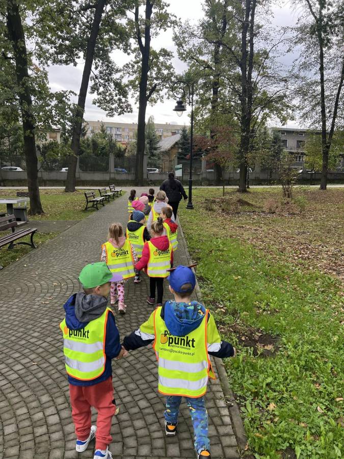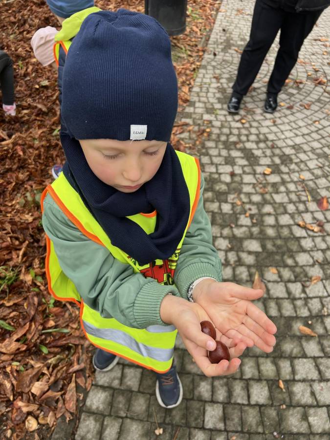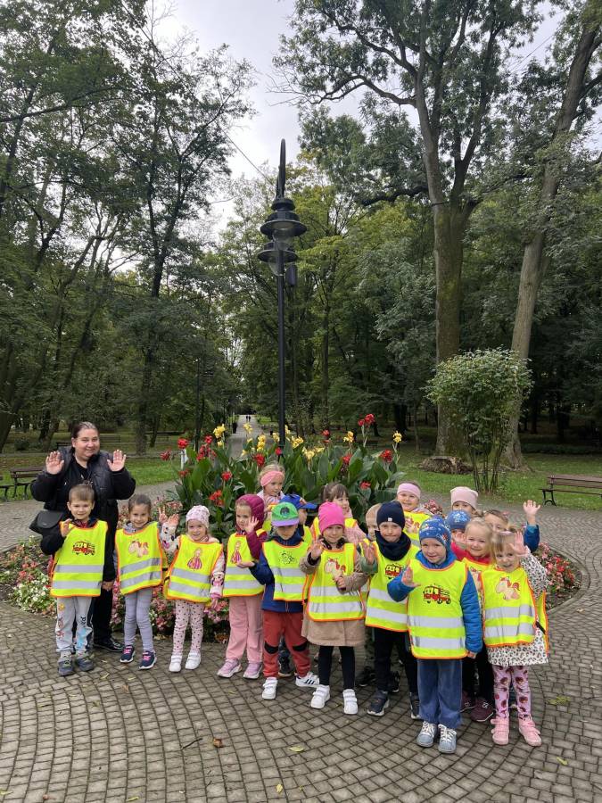 Realizując zadania z programu własnego " Przedszkolak mały patriota i obywatel" dzieci z oddziału II udały się na wycieczkę do Parku Strzeleckiego. Park odkrył przed nami swe piękno. Podziwialiśmy jesienne barwy, rosnące krzewy i drzewa. Bacznie przyglądaliśmy się przyrodzie: korze drzew, liściom, rozmawialiśmy o zwierzętach i ptakach żyjących w parku. Spotkaliśmy nawet wiewiórkę, łabędzie , kaczki. Rozmawialiśmy na temat Mauzoleum gen. Józefa Bema. Najwięcej radości sprawiło dzieciom zbieranie żołędzi i kasztanów, którymi przyozdobiliśmy nasz kącik przyrody. Zadowoleni, z kieszeniami pełnymi żołędzi i kasztanów wróciliśmy do naszego przedszkola.