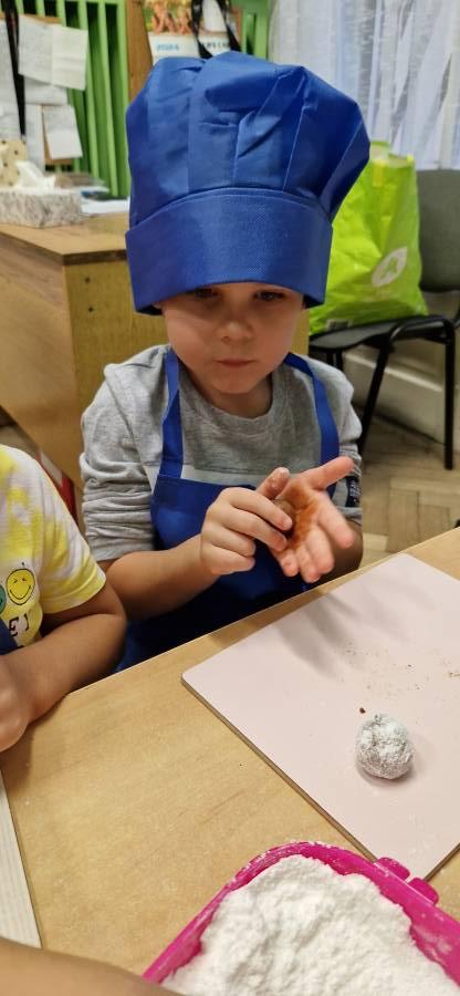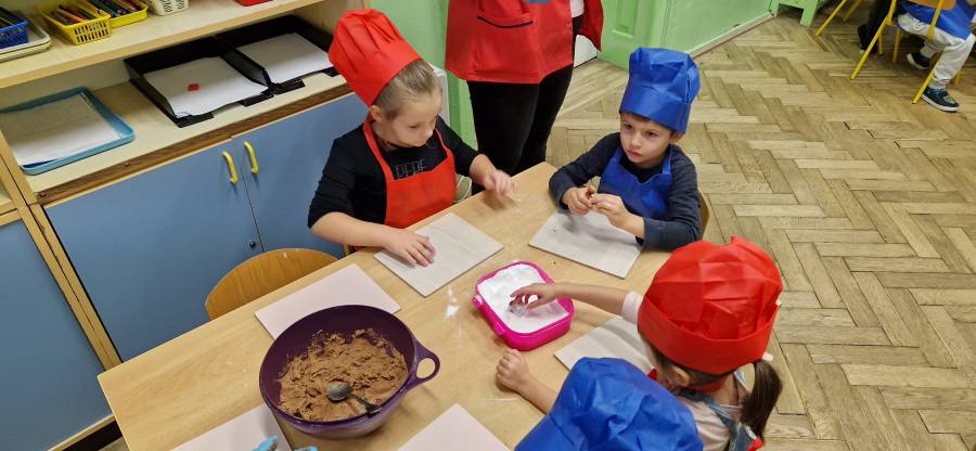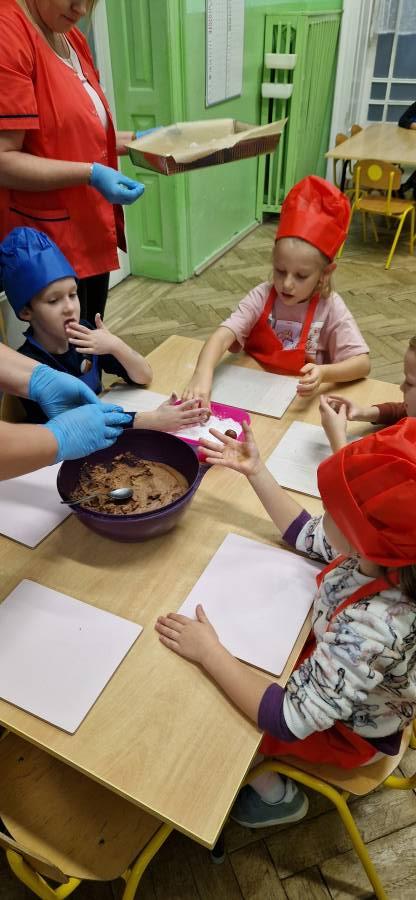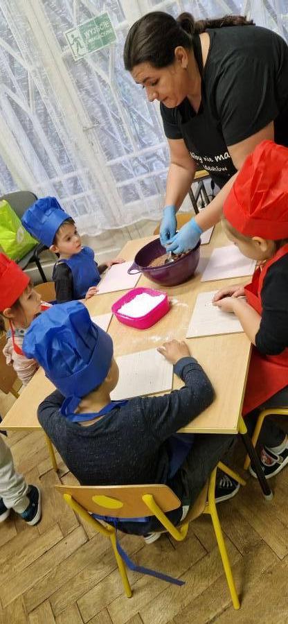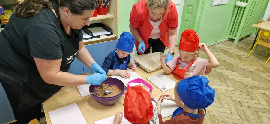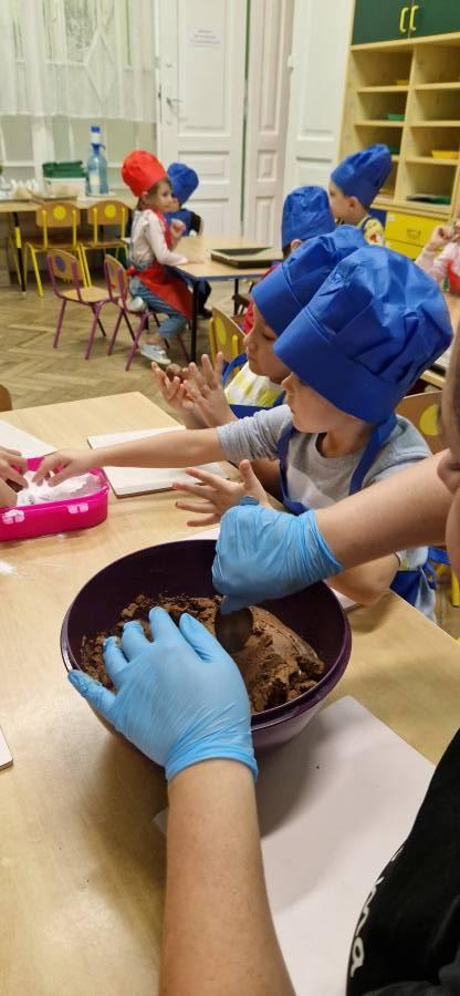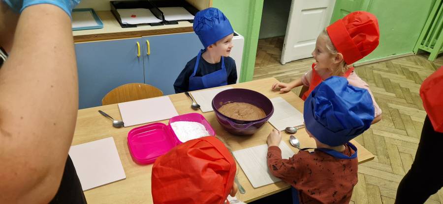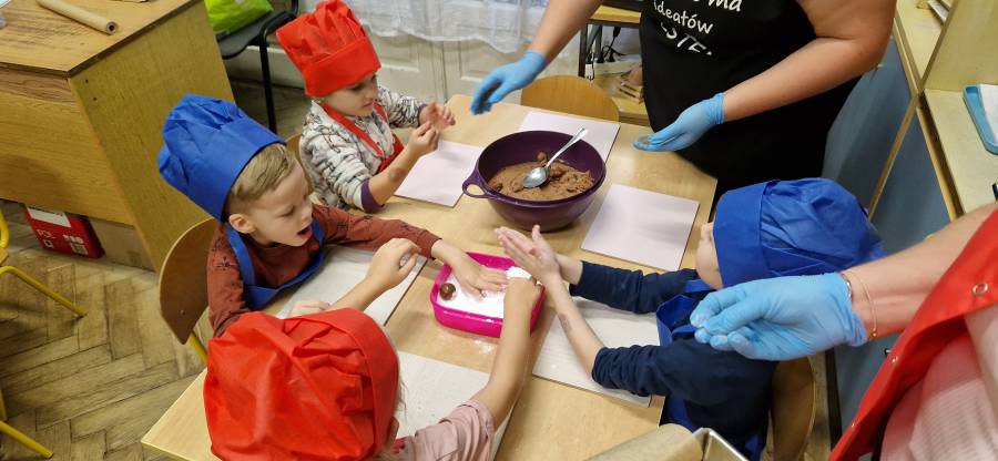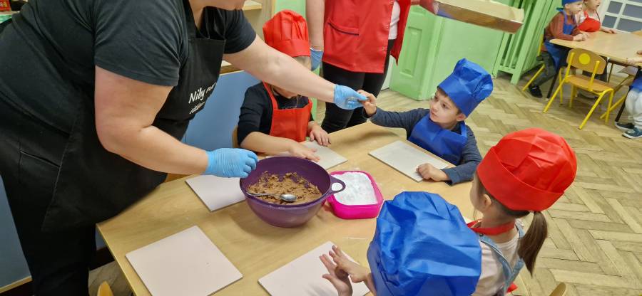 Ostatnie piątkowe przedpołudnie przedszkolaki spędziły niezwykle pracowicie. Z okazji zbliżającego się Święta Edukacji Narodowej grupa Starszaków przygotowywała ciasteczka dla wszystkich Pracowników przedszkola. Każdy przedszkolak miał szansę spróbować swoich sił kulinarnych, dzieci z radością pomagały w przygotowaniu ciasteczek. Wspólne pieczenie było przyjemną zabawą. Działania w ramach programu ,,Skąd się biorą produkty ekologiczne?"
