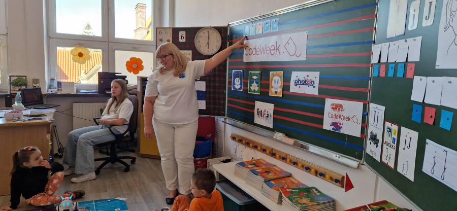 W dniu dzisiejszym grupa Starszaków, wzięła udział w zajęciach CodeWeek, które odbyły się w Szkole Podstawowej nr 3 im. Marii Konopnickiej w Tarnowie. Podczas zajęć dzieci brały udział w szeregu zabaw rozwijających umiejętności kodowania i logicznego myślenia. Za aktywny udział w zajęciach nasze przedszkole zostało uhonorowane specjalnym certyfikatem.