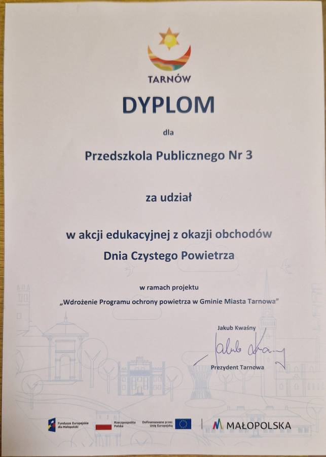 W dniu 21.11.2024 w Sali Lustrzanej odbyło się rozstrzygnięcie konkursu związanego z obchodami Dnia Czystego Powietrza w ramach projektu " Wdrożenie Programu Ochrony Powietrza w Gminie Miasta Tarnowa" Za szereg działań ekologicznych na ręce Pani Dyrektor i przedstawicielek naszego przedszkola Igi Ł i Igi M otrzymaliśmy dyplom oraz pakiet cebulek roślin wieloletnich, które posadzimy w naszym przedszkolnym ogródku. Wszystkim przedszkolakom serdecznie gratulujemy.