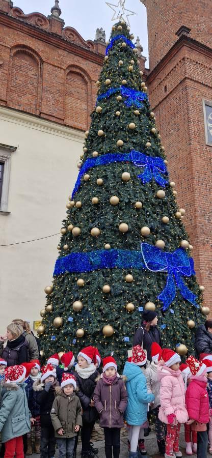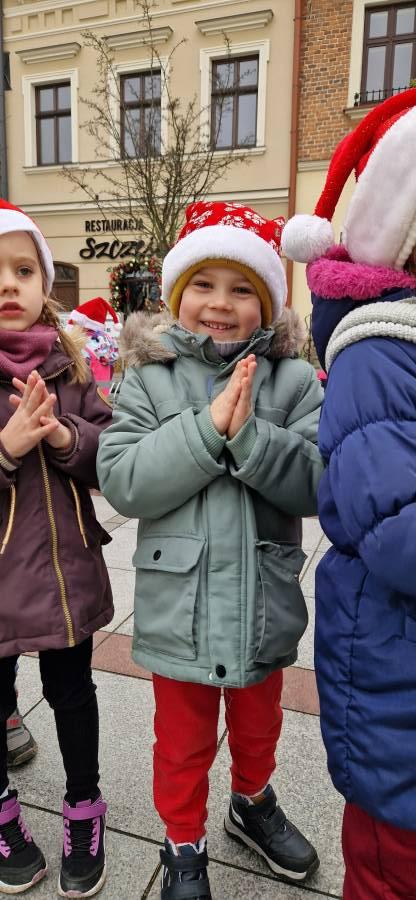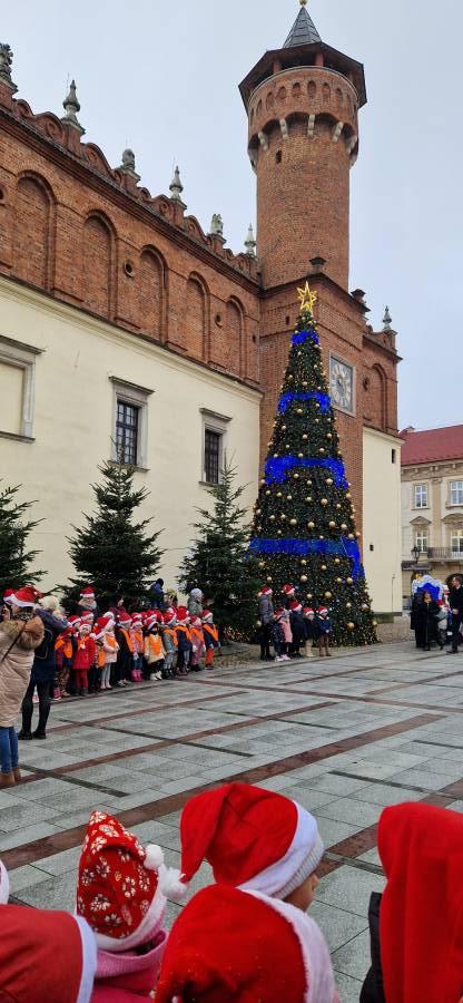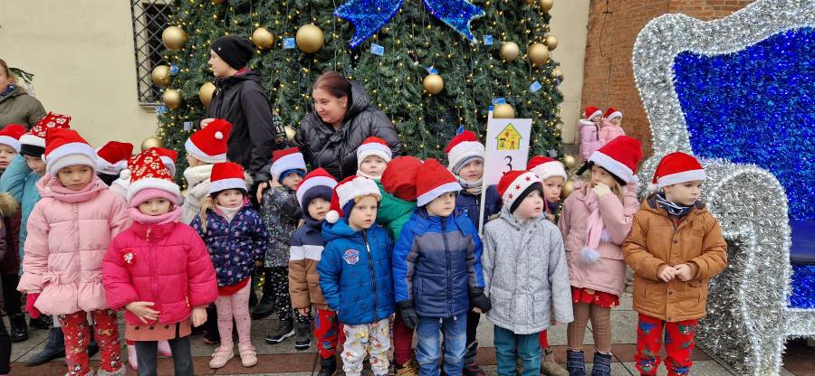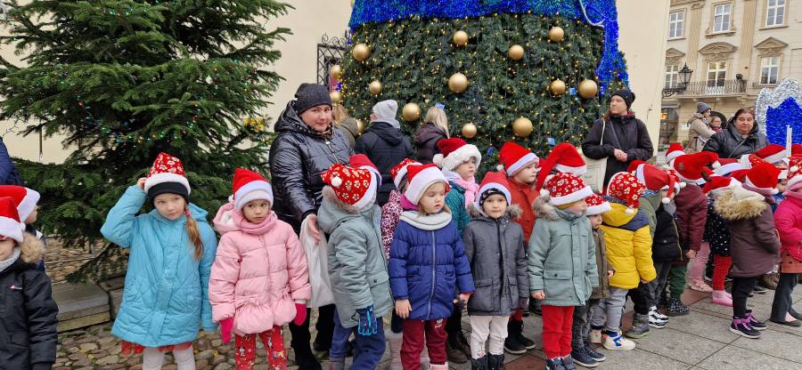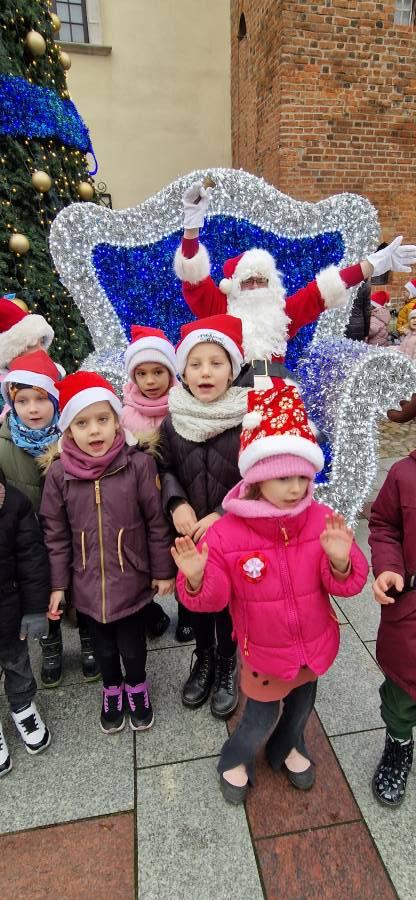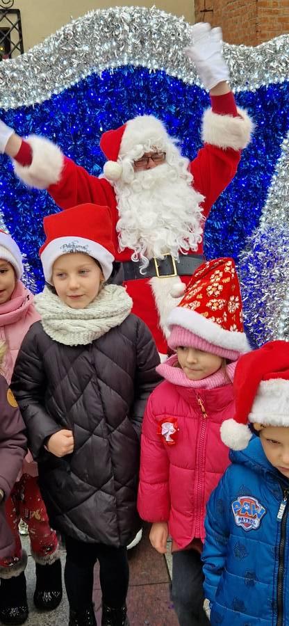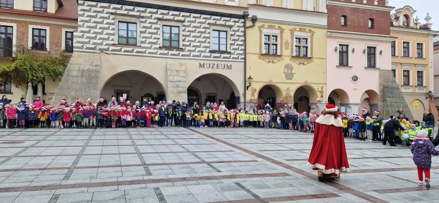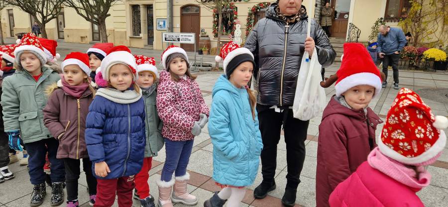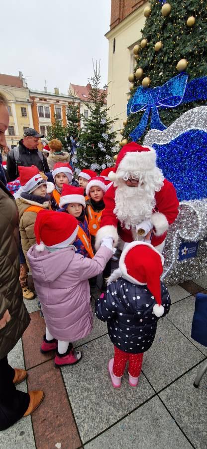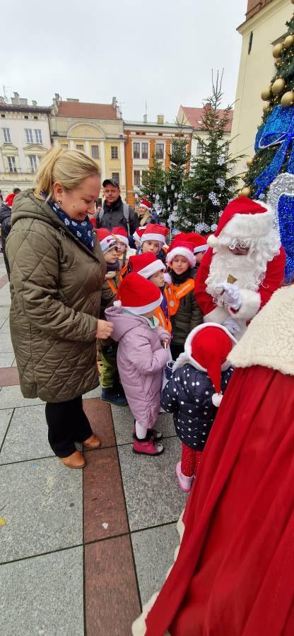 5.12.2024 W dniu dzisiejszym dzieci z oddziału II i III udały się na Tarnowski Rynek , aby spotkać się z długo oczekiwanym gościem - Mikołajem. Ogromna radość i wzruszenie towarzyszyło najmłodszym mieszkańcom naszego miasta. Śpiewaliśmy wspólnie piosenki, dzieci ubrane były w piękne, czerwone mikołajkowe czapki. Wykonane w przedszkolu białe śnieżynki zawiesiliśmy na choinkach , aby zdobiły nasz rynek. Jeszcze tylko pamiątkowe zdjęcia z Mikołajem, słodkości od Pana Prezydenta Jakuba Kwaśnego i pełni emocji wróciliśmy do przedszkola. Zachęcamy rodziców, aby aktywnie spędzając czas z dziećmi udali się na rodzinny spacer po tarnowskim rynku.