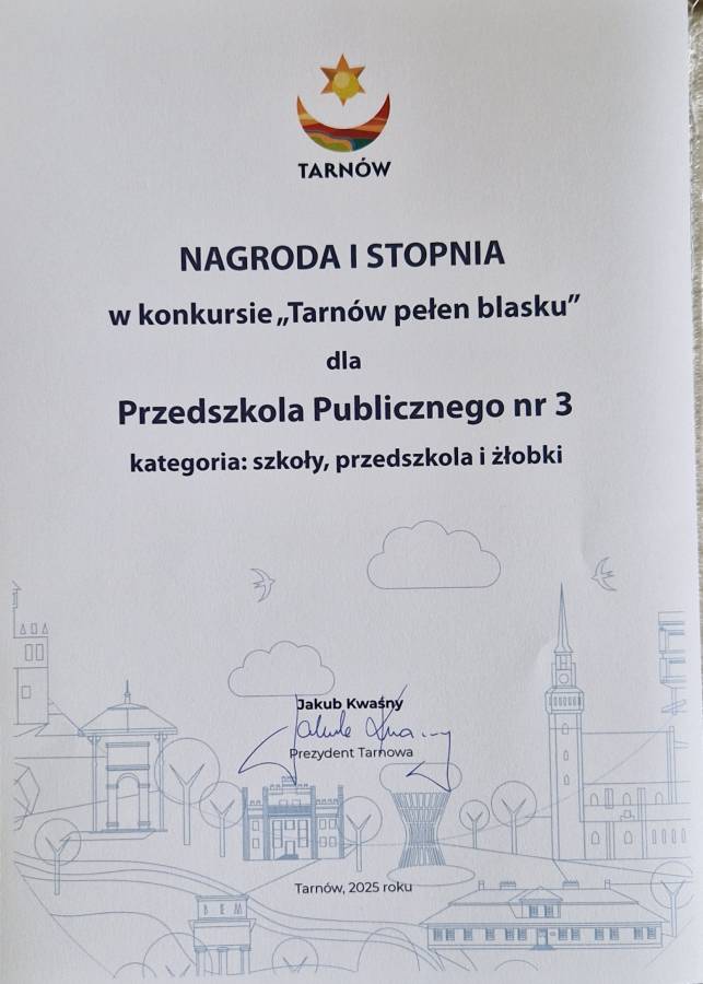 Rozstrzygnięto XI edycje konkursu "Tarnów Pełen Blasku" - wielki sukces naszego przedszkola. W kategorii szkoły, przedszkola i żłobki zabłysnęliśmy blaskiem i uzyskaliśmy Nagrodę I stopnia. Tegoroczny konkurs obfitował w rekordową liczbę zgłoszeń. Tym bardziej cieszy fakt, że komisja konkursowa zauważyła nasze świąteczne iluminacje i uhonorowała naszą pracę.