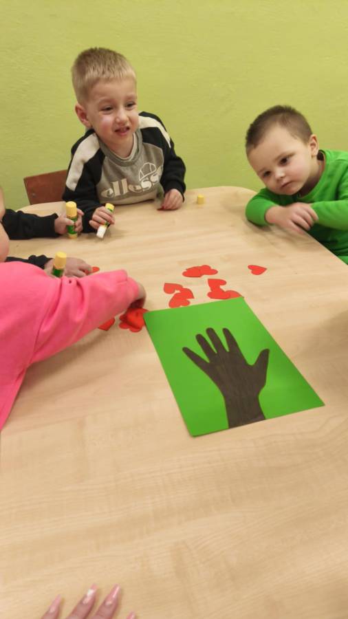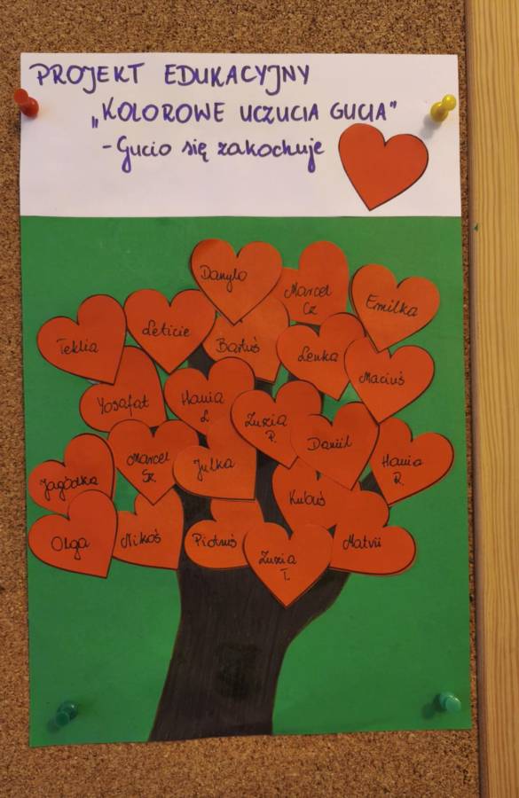 Dzieci z oddziału I wykonały kolejne zadanie z Międzynarodowego projektu "Kolorowe uczucia Gucia". Z okazji Walentynek poznaliśmy opowiadanie "Kolorowe uczucia Gucia - Gucio się zakochuje", dzieci mówiły kogo kochają, a na koniec wykonaliśmy drzewko miłości