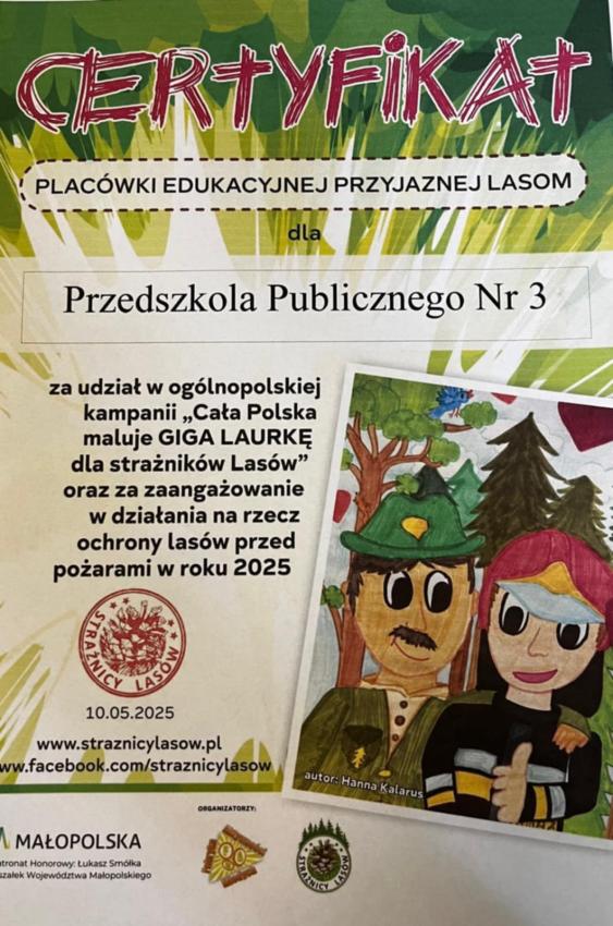 W miesiącu kwietniu dzieci z naszego przedszkola brały udział w akcji ?Giga laurka dla strażników lasów?. Byliśmy jedną z 2999 placówek, które zaangażowały się w akcję, tworząc piękne, kolorowe prace, mówiące o strażakach i leśnikach, za co nasze przedszkole otrzymało Certyfikat Placówki Edukacyjnej Przyjaznej Lasom. Strażnicy Lasów dziękujemy za Waszą pracę! #straznicylasow