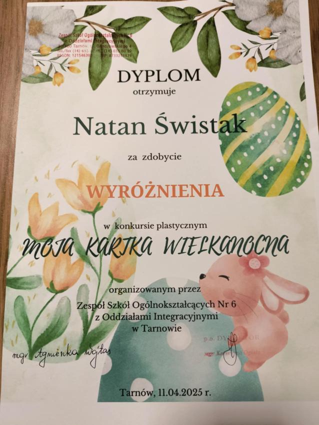 Rozstrzygnięcie konkursu " Moja kartka wielkanocna" organizowanego przez Szkołę Podstawową Nr 25. Wyróżnienie otrzymał Natan Świstak. Gratulujemy.