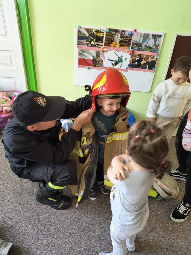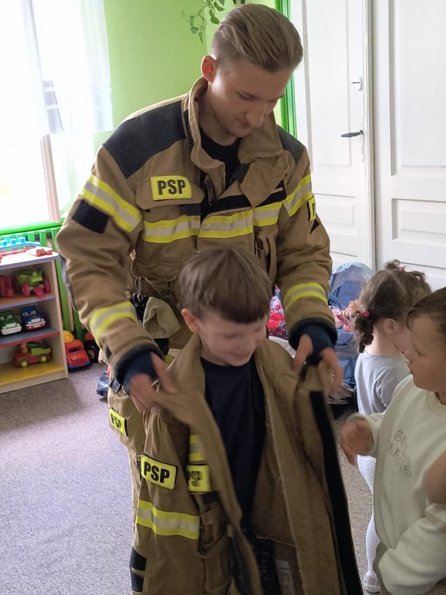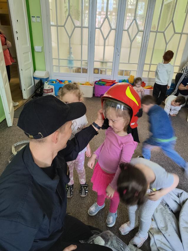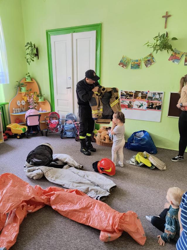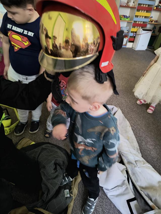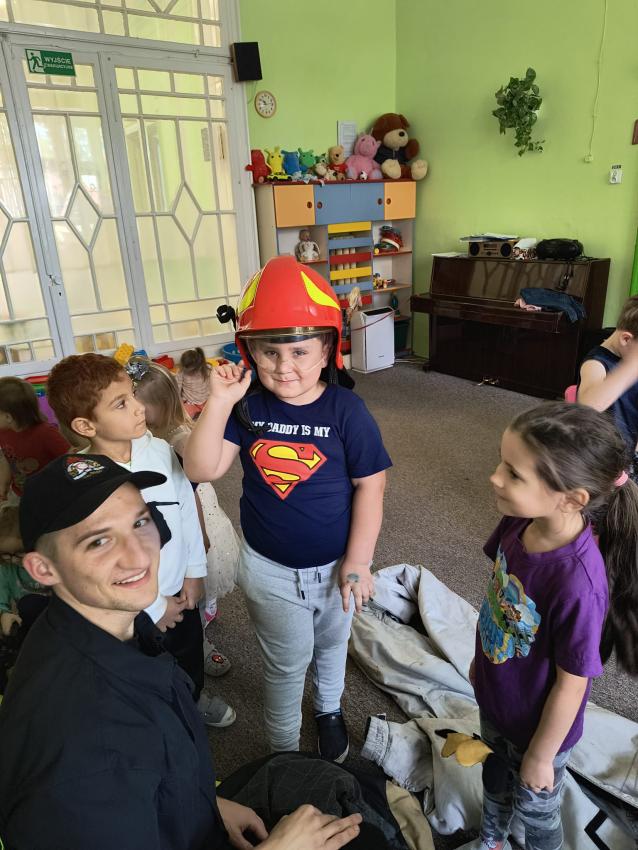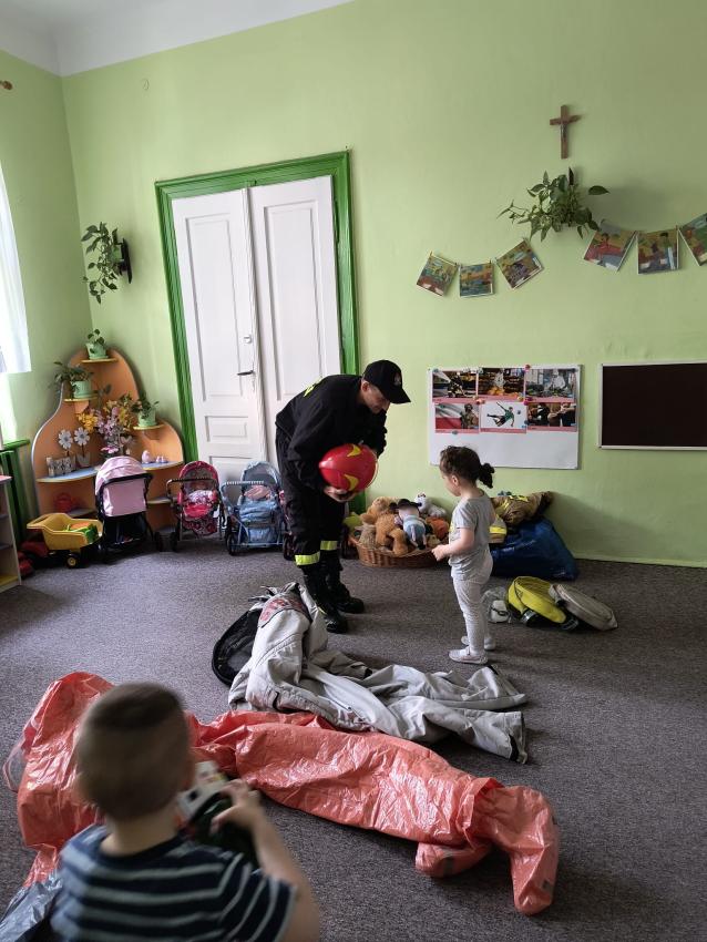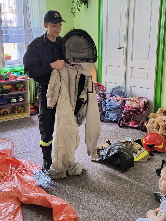 22.05 nasze przedszkole odwiedził strażak z Komendy Miejskiej Państwowej Straży Pożarnej w Tarnowie. Pan strażak z zaangażowaniem i pasją opowiadał o swoim zawodzie, pokazywał dzieciom stroje które strażak ubiera na akcje, opowiadał o sprzęcie jaki jest używany podczas akcji.