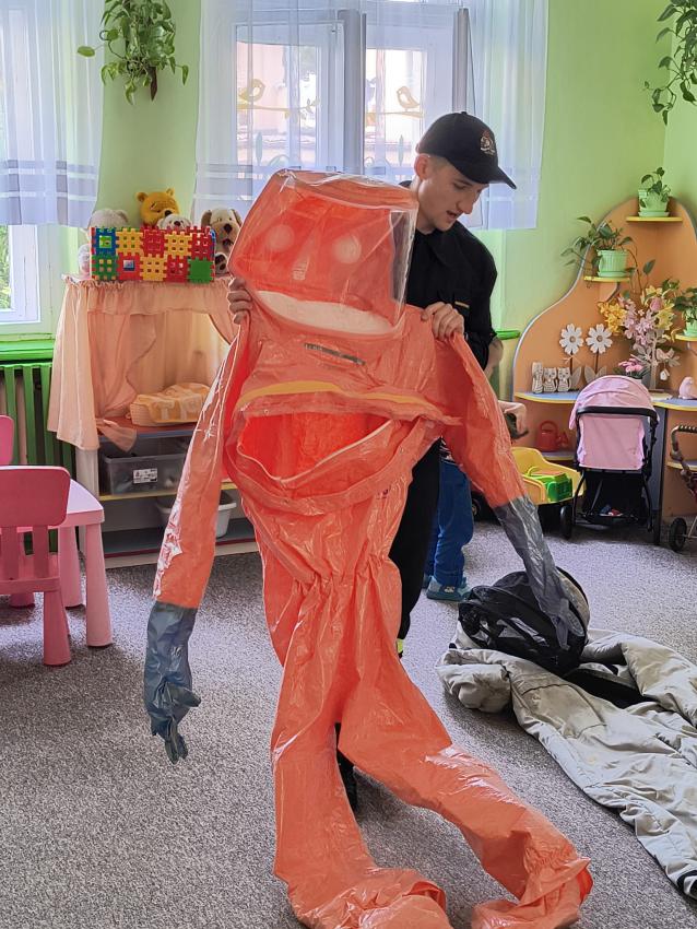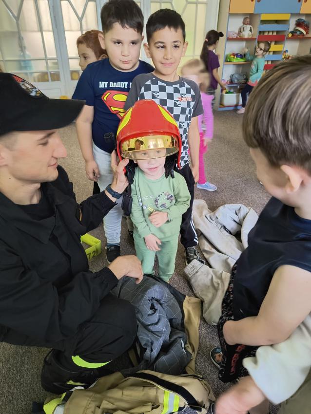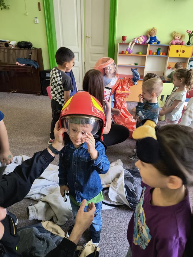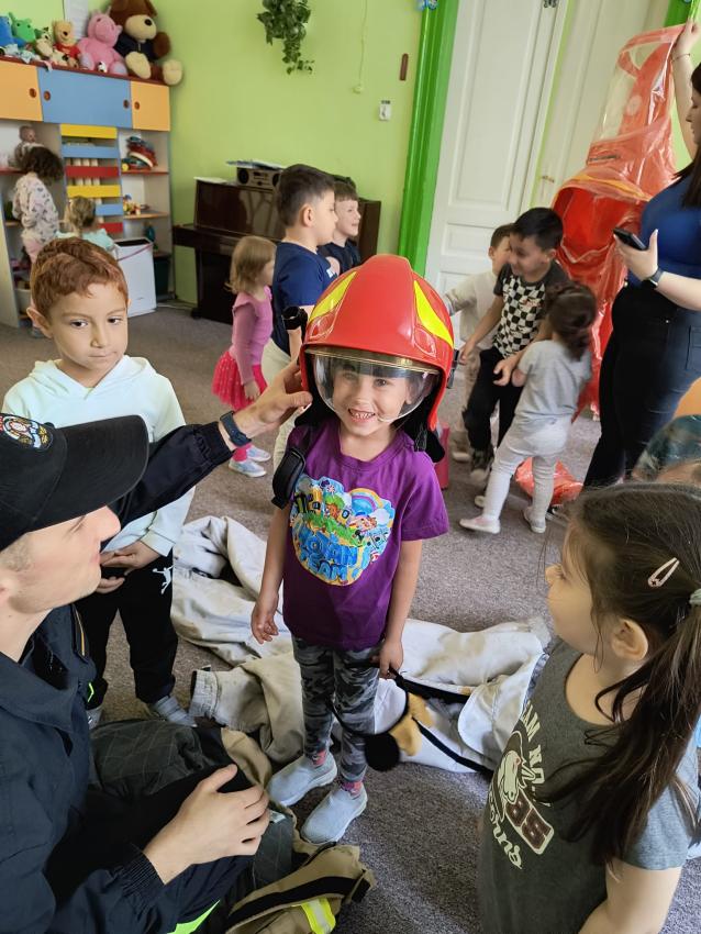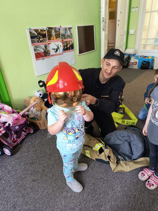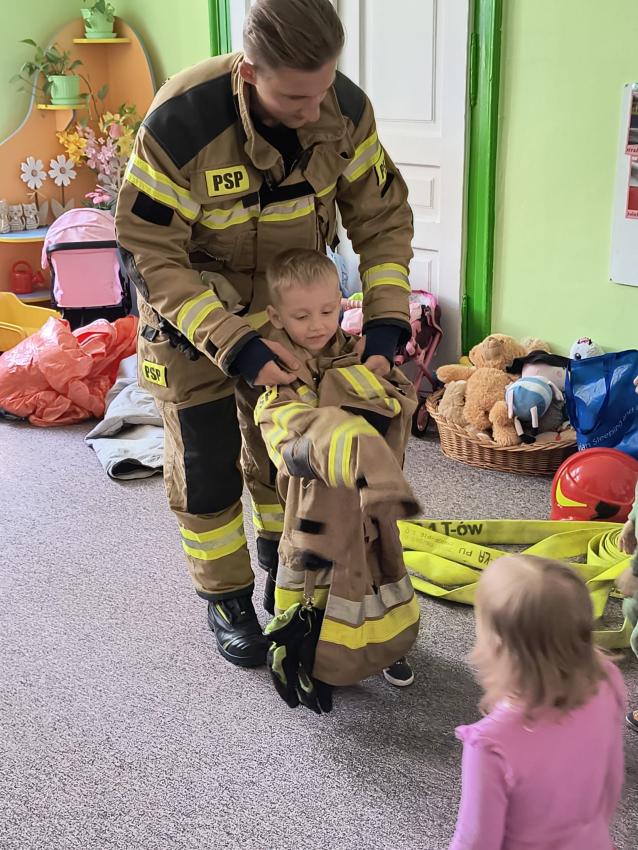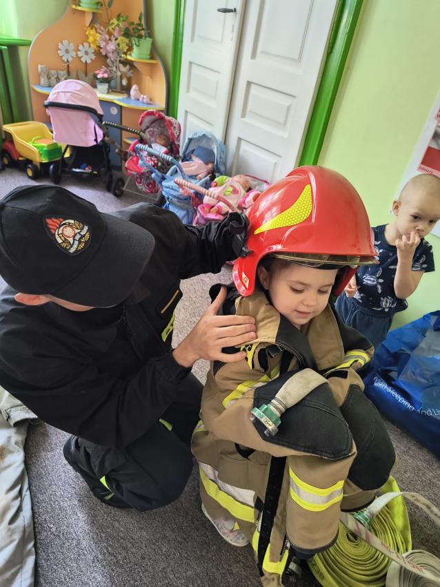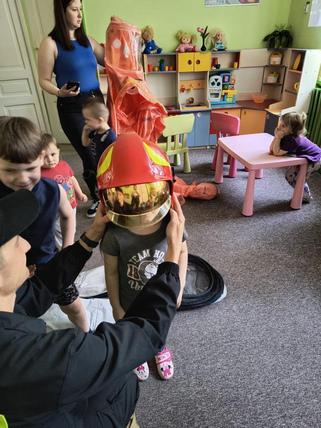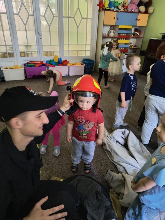 22.05 nasze przedszkole odwiedził strażak z Komendy Miejskiej Państwowej Straży Pożarnej w Tarnowie. Pan strażak z zaangażowaniem i pasją opowiadał o swoim zawodzie, pokazywał dzieciom stroje które strażak ubiera na akcje, opowiadał o sprzęcie jaki jest używany podczas akcji.