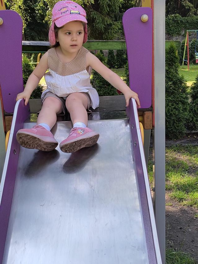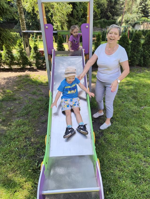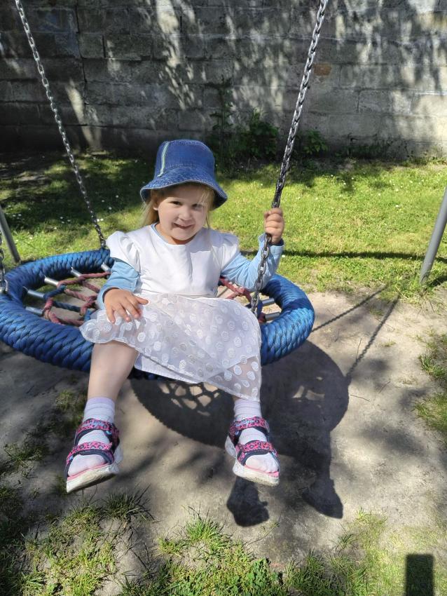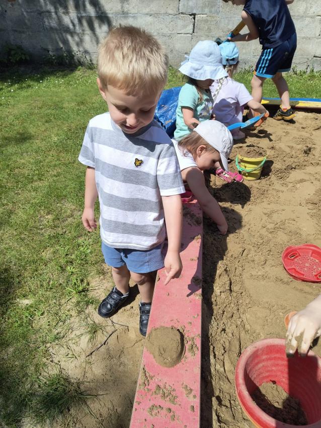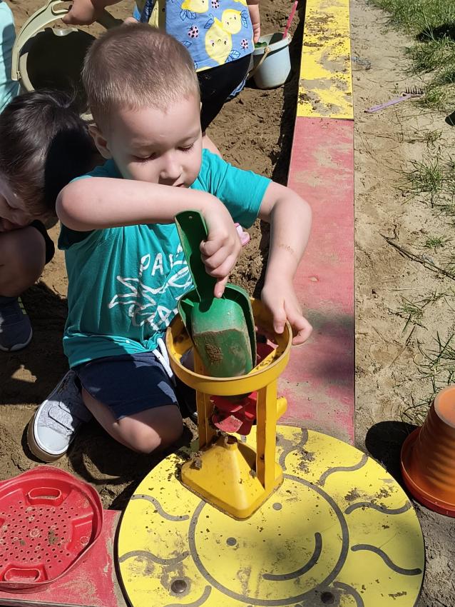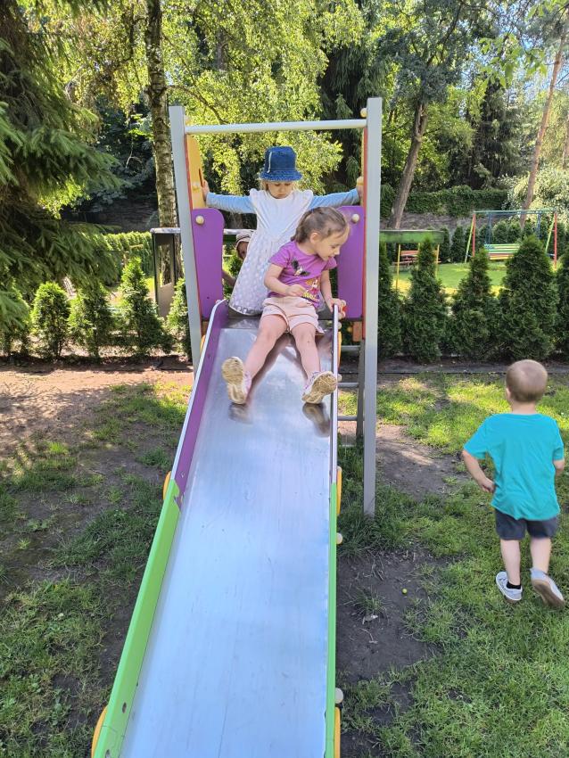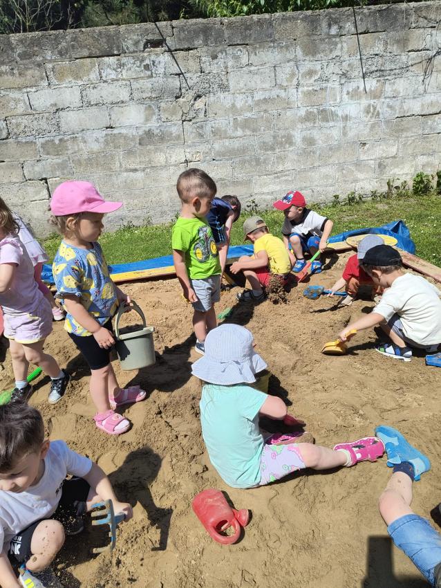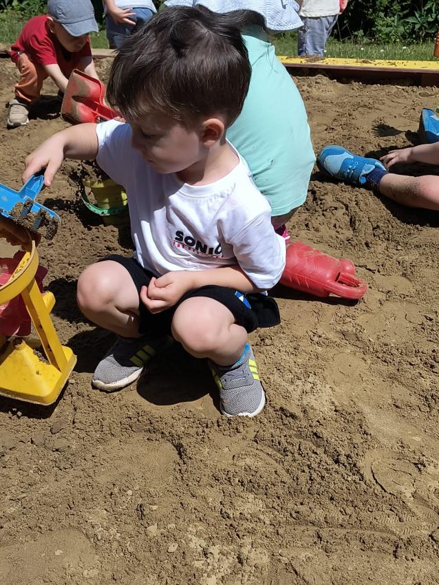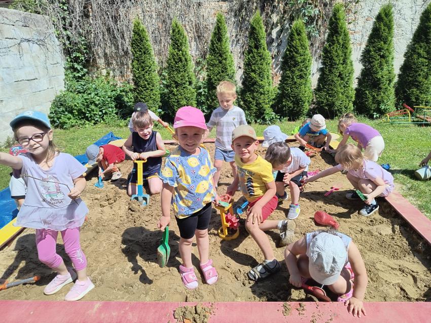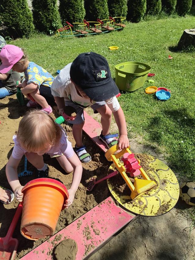 Maluszki korzystają ze słonecznej pogody, podczas zabaw w przedszkolnym ogrodzie.