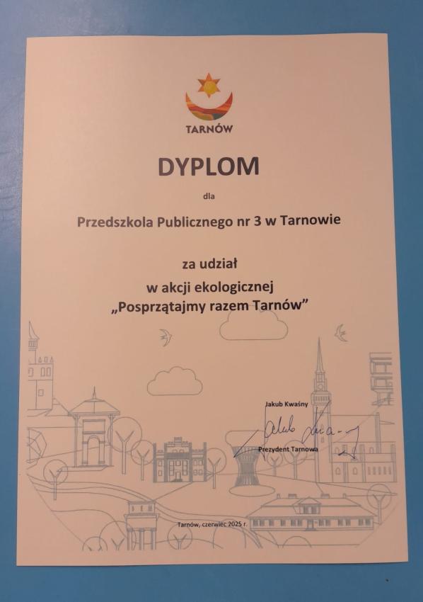 Grupa llI ,,Żyrafy" uczestniczyła w XXV akcji ,, Posprzątajmy razem Tarnów". W dniu 16.06 w Sali Lustrzanej odbyło się uroczyste podsumowanie akcji.