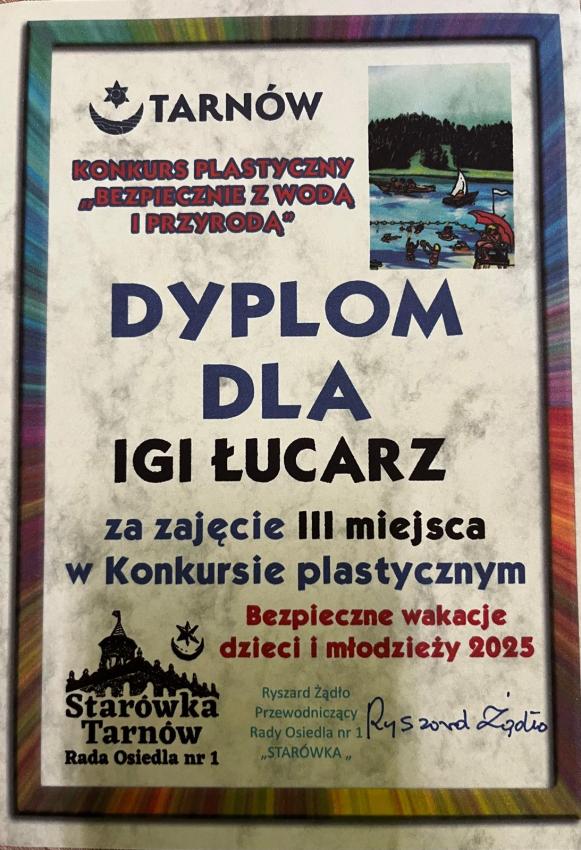 Sukces naszej koleżanki Igi Łucarz z grupy "Żabki" w konkursie plastycznym " Bezpiecznie z wodą i przyrodą" Iga zajęła III miejsce w konkursie organizowanym przez Radę Osiedla Starówka. Serdecznie gratulujemy!