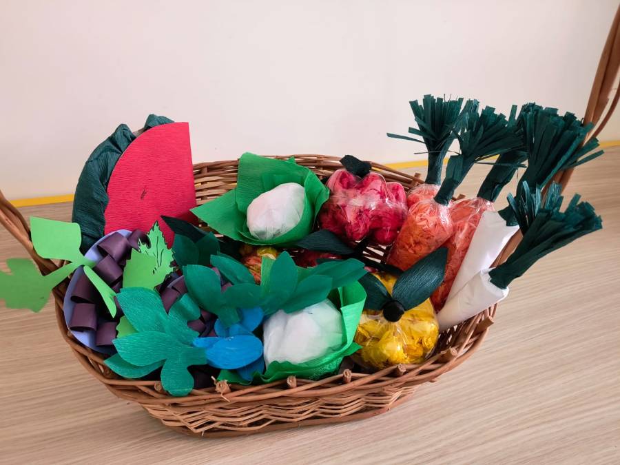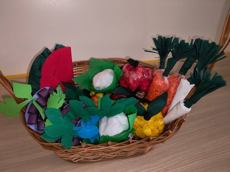 W minionym tygodniu dzieci z grupy "Żabek" i "Żyrafek" rozwijając kreatywność i sprawność manualną wykonały z małą pomocą pań "kosz owocowo - warzywny", który można obecnie podziwiać w przedszkolnej szatni.