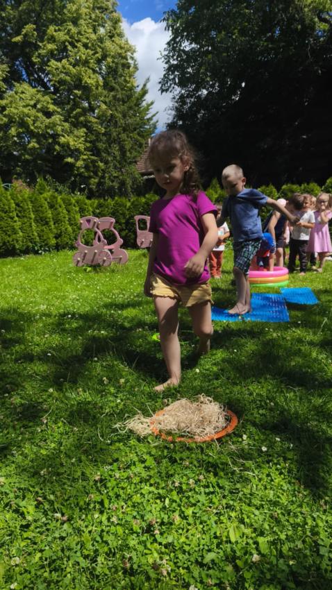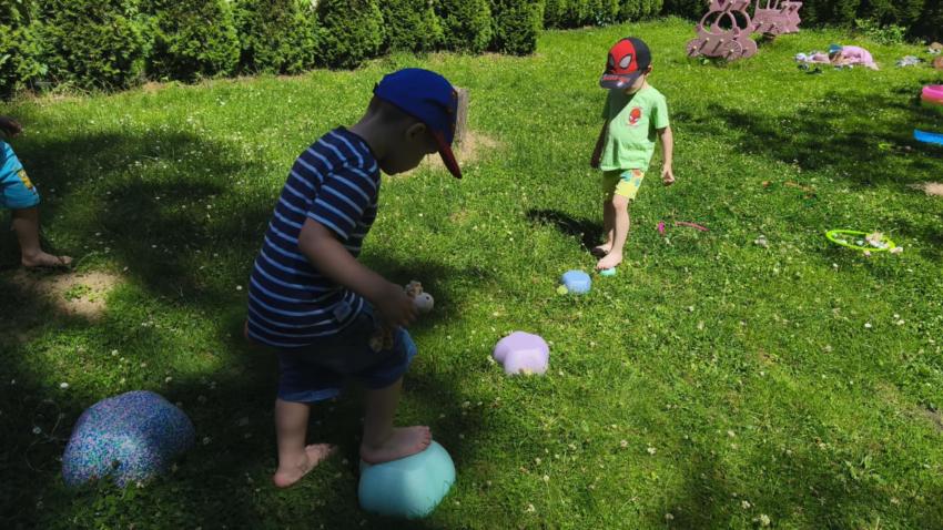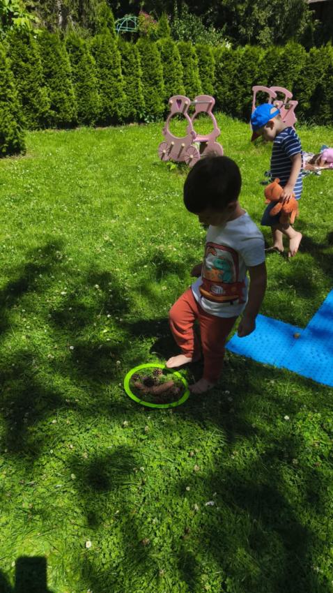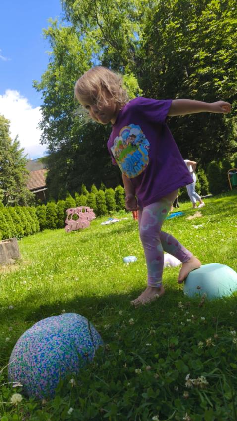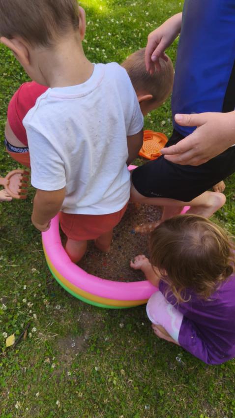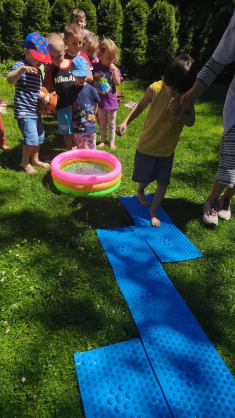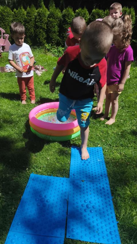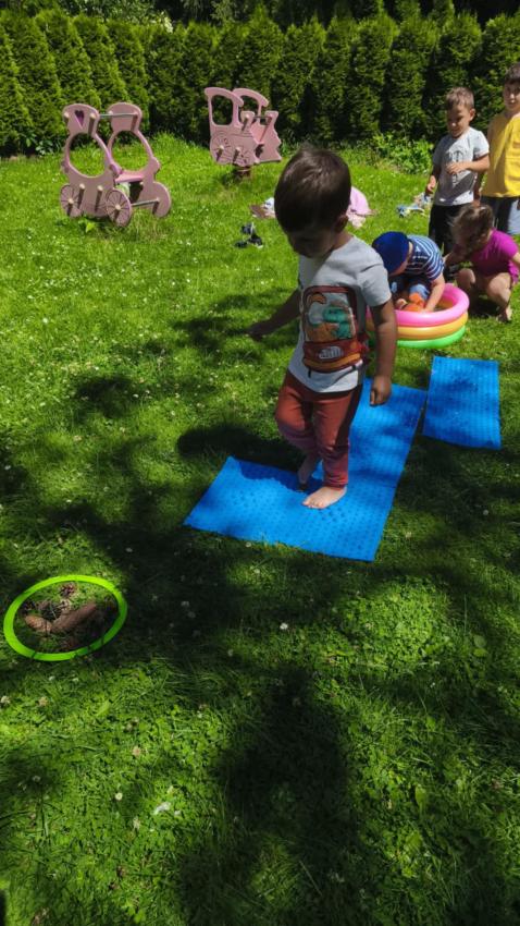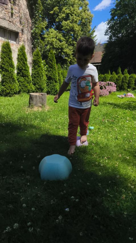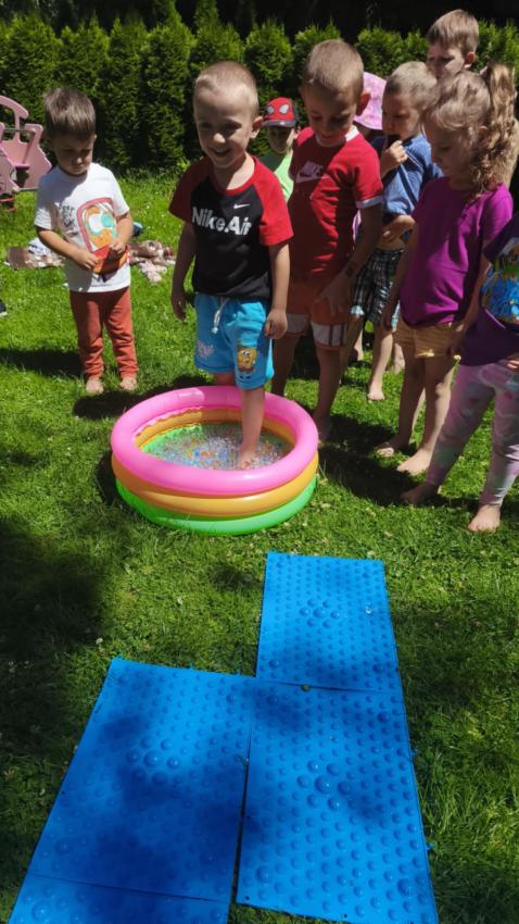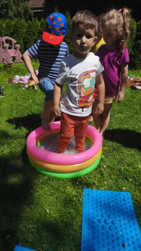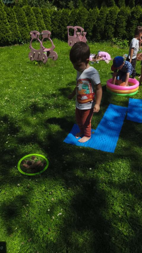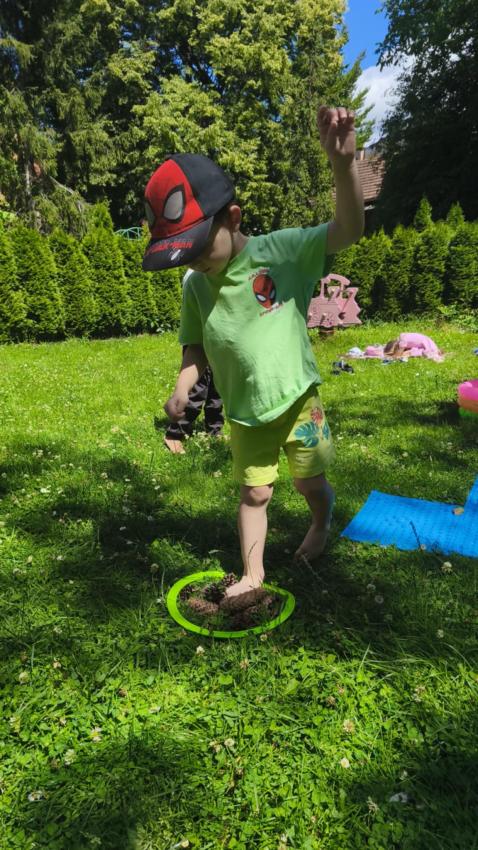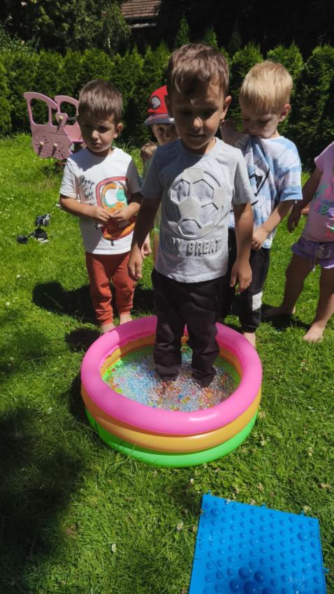 Zajęcia Sensoryczne w Ogrodzie Podczas naszych ogrodowych zajęć sensorycznych dzieci miały okazję do niezwykłej, wielozmysłowej przygody! W specjalnie przygotowanej przestrzeni czekały na nie: basen wypełniony kolorowymi kulkami hydrożelowymi, ścieżka sensoryczna z różnorodnych naturalnych materiałów, takich jak szyszki, mech, trawa, sianko, pompony i włóczki o różnych fakturach ? także tych delikatnie kłujących, tor przeszkód, który zachęcał do przeskakiwania przez elementy o różnych rozmiarach i kształtach, oraz zabawy w piaskownicy, gdzie dzieci mogły formować, przesypywać i dotykać piasku gołymi rękami i stopami. Wszystkie aktywności odbywały się na boso, co pozwalało dodatkowo stymulować receptory czuciowe na stopach, wspierając rozwój integracji sensorycznej i koordynacji ruchowej. Zajęcia były nie tylko świetną zabawą, ale też doskonałą okazją do odkrywania świata poprzez zmysły ? w ruchu, w kontakcie z naturą i w atmosferze swobodnej eksploracji.