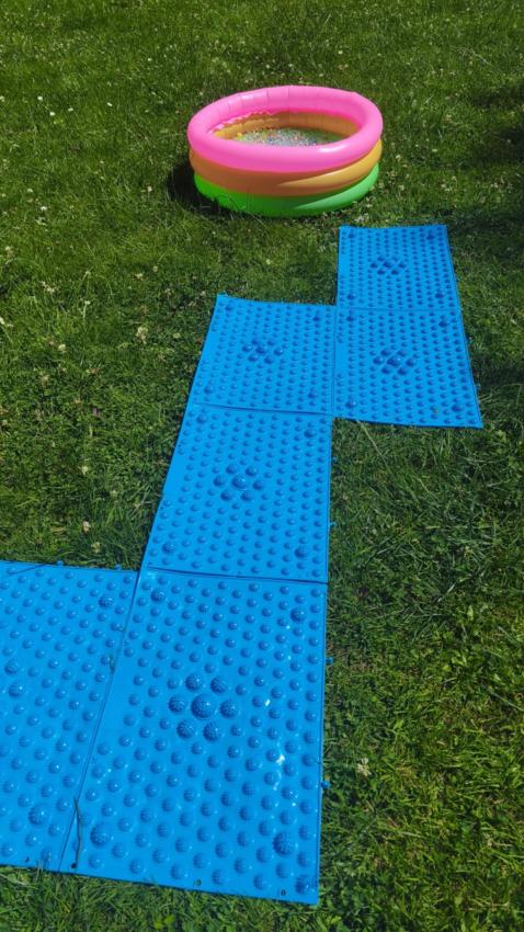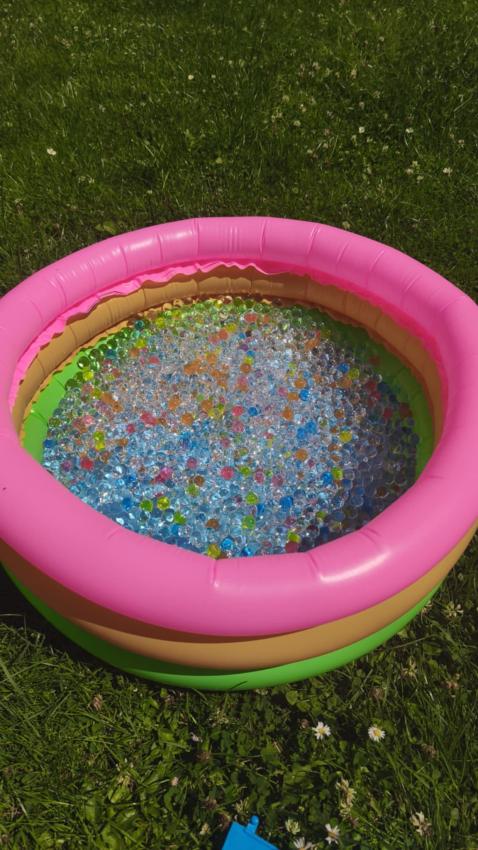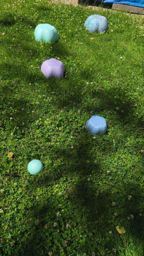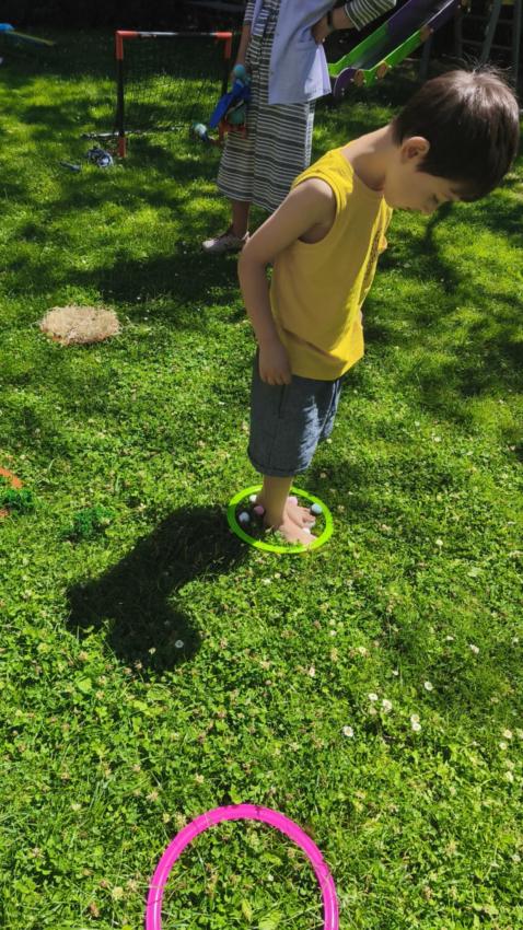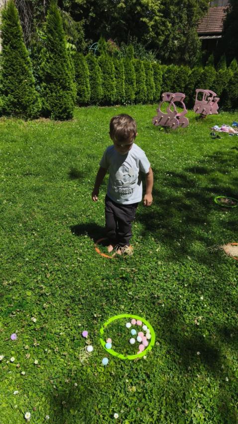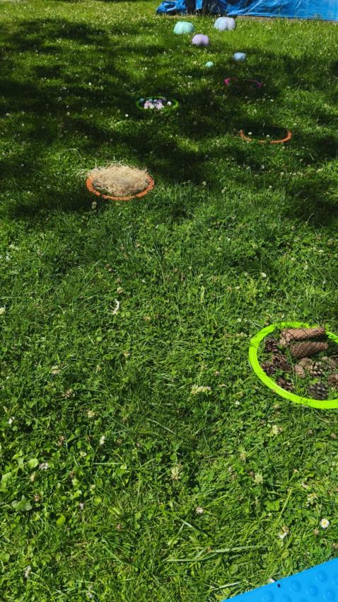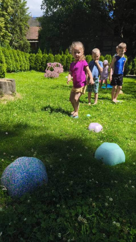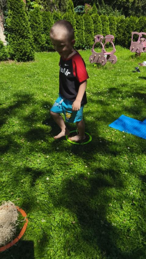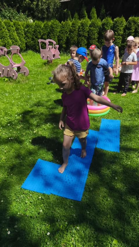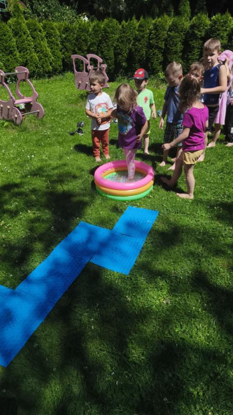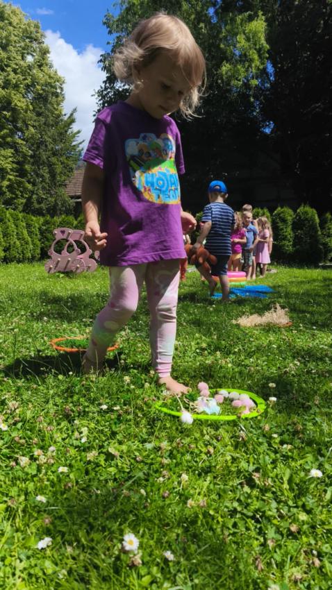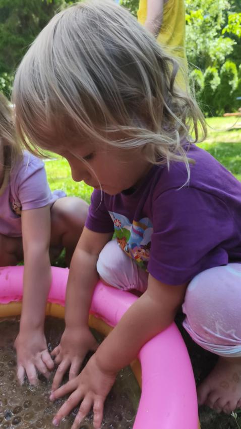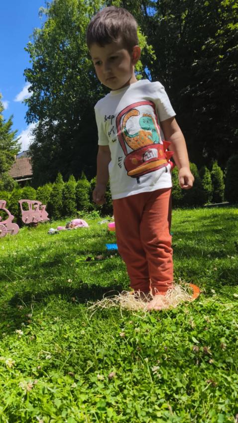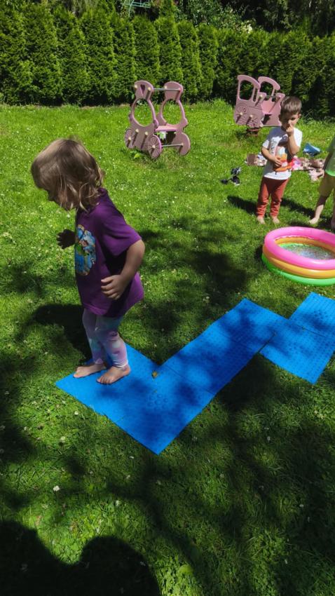Zajęcia Sensoryczne w Ogrodzie Podczas naszych ogrodowych zajęć sensorycznych dzieci miały okazję do niezwykłej, wielozmysłowej przygody! W specjalnie przygotowanej przestrzeni czekały na nie: basen wypełniony kolorowymi kulkami hydrożelowymi, ścieżka sensoryczna z różnorodnych naturalnych materiałów, takich jak szyszki, mech, trawa, sianko, pompony i włóczki o różnych fakturach ? także tych delikatnie kłujących, tor przeszkód, który zachęcał do przeskakiwania przez elementy o różnych rozmiarach i kształtach, oraz zabawy w piaskownicy, gdzie dzieci mogły formować, przesypywać i dotykać piasku gołymi rękami i stopami. Wszystkie aktywności odbywały się na boso, co pozwalało dodatkowo stymulować receptory czuciowe na stopach, wspierając rozwój integracji sensorycznej i koordynacji ruchowej. Zajęcia były nie tylko świetną zabawą, ale też doskonałą okazją do odkrywania świata poprzez zmysły ? w ruchu, w kontakcie z naturą i w atmosferze swobodnej eksploracji.