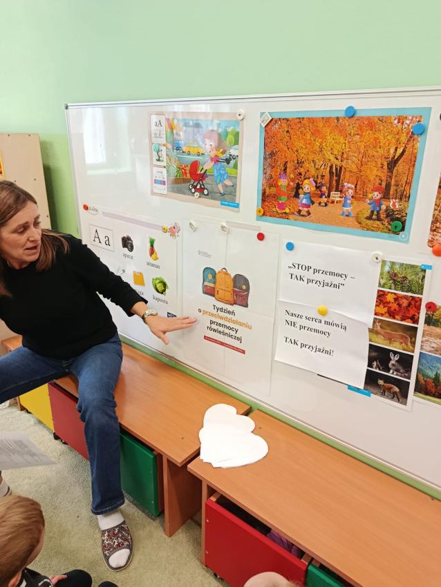 W dniach 29.09- 3.10.2025 uczestniczyliśmy w ogólnopolskiej inicjatywie Ministerstwa Edukacji Narodowej " Tydzień o budowaniu relacji" Odbyły się zajęcia dotyczące rozpoznawania emocji i rozwiązywania konfliktów. Działania ukierunkowane były na wsparcie dzieci w sytuacjach trudnych. Zostały one rozszerzone poprzez realizację programu "Przyjaciele Zippiego" międzynarodowy program promocji zdrowia psychicznego. Uświadamialiśmy dzieci , że krzywdzenie i przemoc są złe.