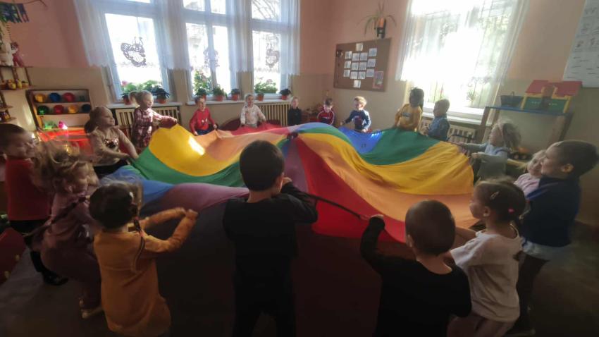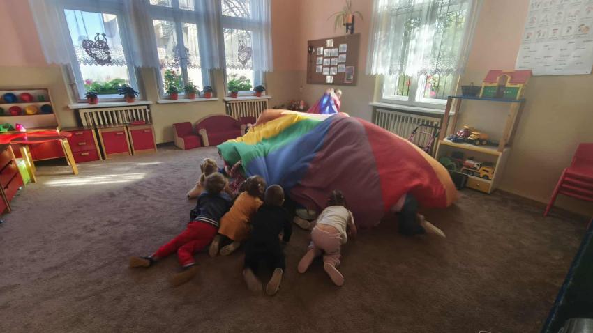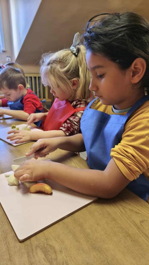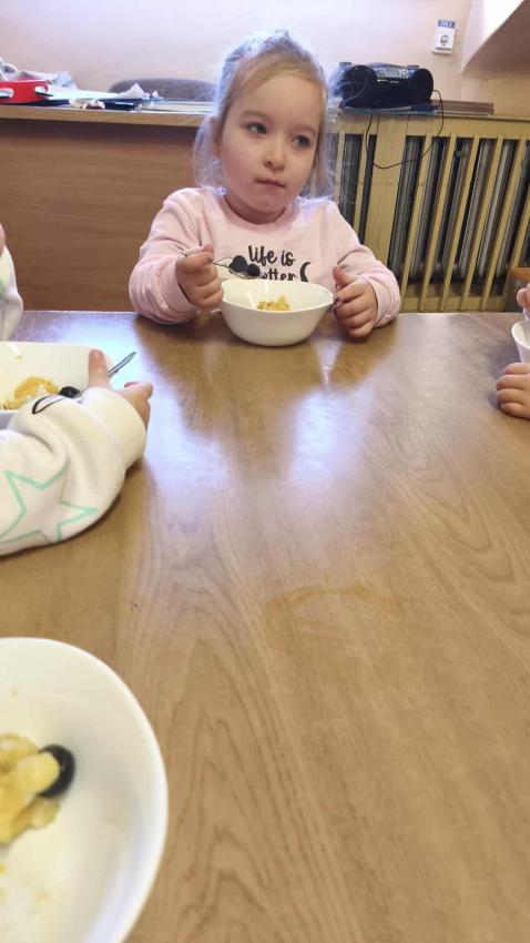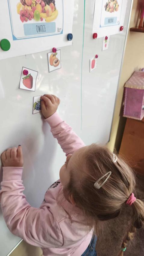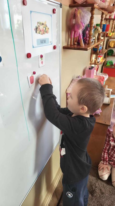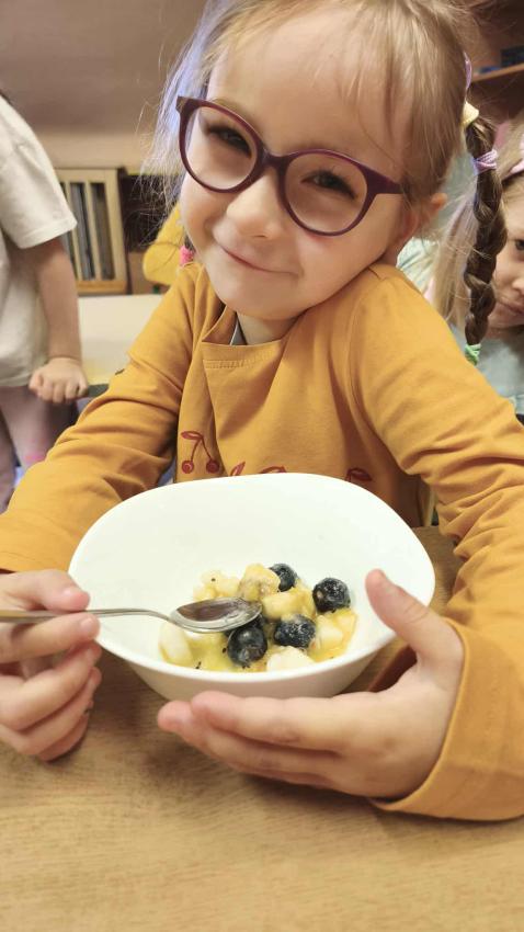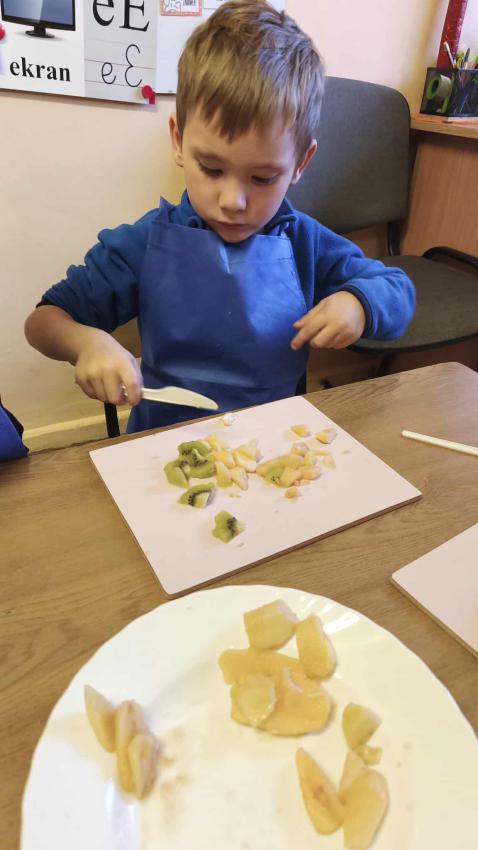 Było dużo zabawy z chustą Klanza, wspólne segregowanie owoców i warzyw, a na koniec ? pyszna, samodzielnie przygotowana sałatka owocowa!