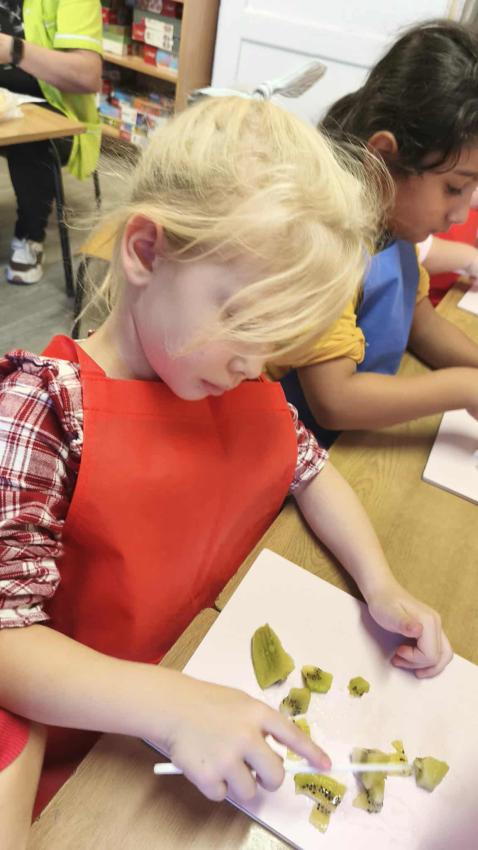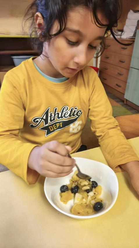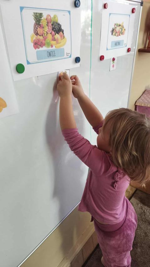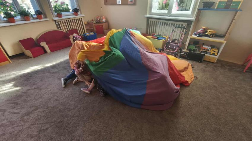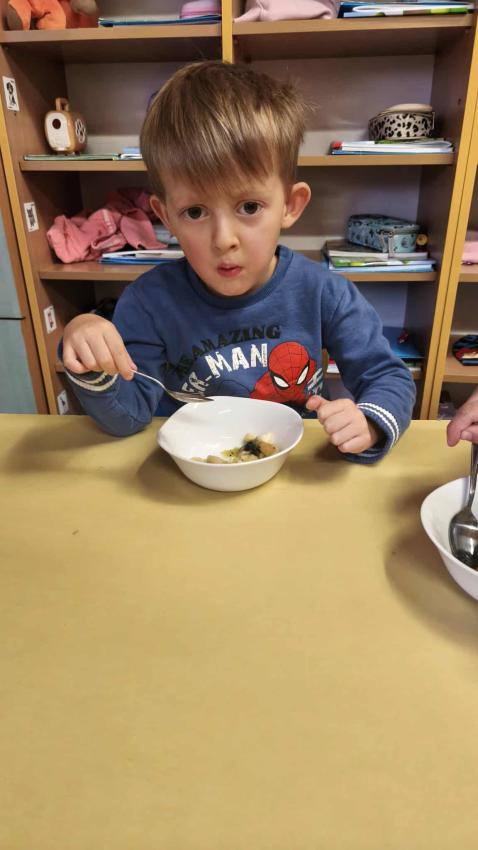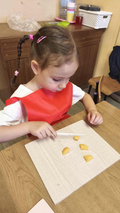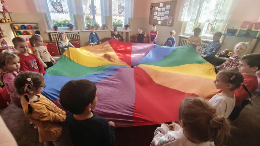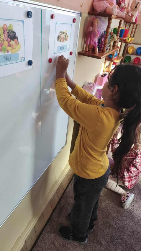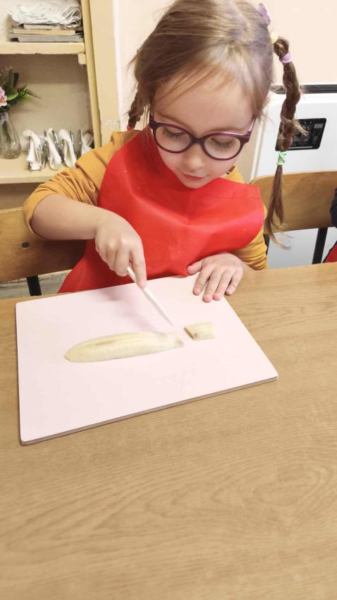 Było dużo zabawy z chustą Klanza, wspólne segregowanie owoców i warzyw, a na koniec ? pyszna, samodzielnie przygotowana sałatka owocowa!