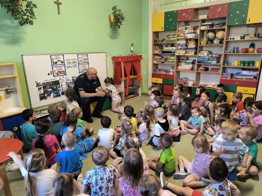 Realizując kolejne zadanie z zakresu Standardów Ochrony Małoletnich, oraz z okazji zbliżających się wakacji w naszym przedszkolu odbyło się spotkanie z policjantem. Rozmawialiśmy na temat bezpieczeństwa w czasie wakacji w górach, nad morzem, jeziorem, na basenie czy placu zabaw. Jak bezpiecznie poruszać się z rodzicami autem. Co musimy ubierać kiedy jedziemy rowerem czy hulajnogą. Pan policjant opowiadał nam jak zachować się gdy zaczepi nas ktoś nieznajomy, kiedy zgubimy się w sklepie. Utrwaliliśmy sobie wszystkie numery alarmowe.