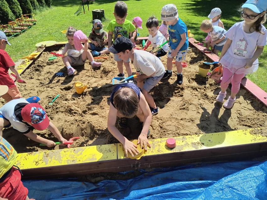 Maluszki korzystają ze słonecznej pogody, podczas zabaw w przedszkolnym ogrodzie.
