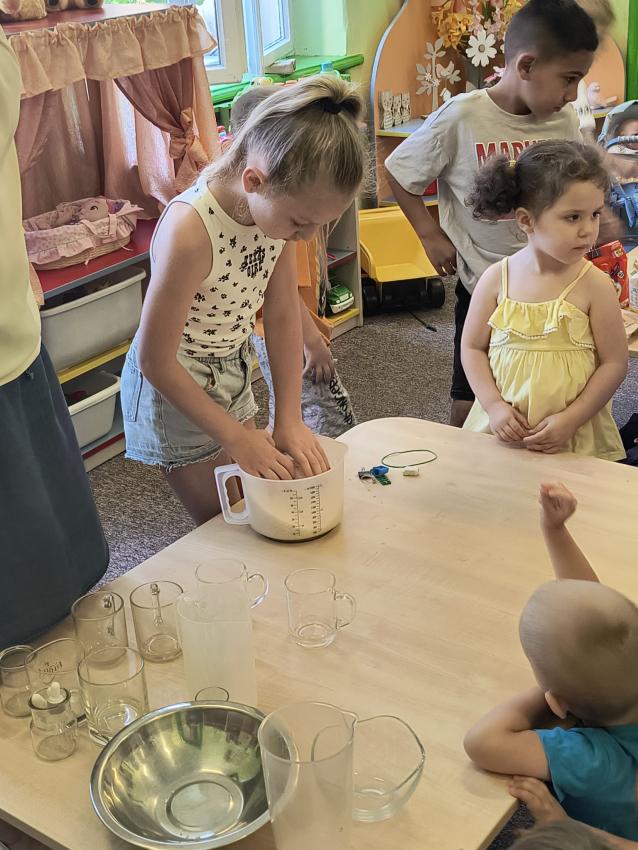 18 czerwca odbyły się zajęcia koleżeńskie, w których brały udział wszystkie przedszkolaki. Celem zajęć było odkrywanie zależności ilości ciał sypkich i płynów od wielkości naczynia, a także rozumienie pojęć: połowa, więcej, mniej, tyle samo. Dzieci mogły przelewać wodę oraz przesypywać ryż tak aby nic się nie wylało i nie wysypało. Miały również okazję używać pipetki (kroplomierza), co okazało się nie tak łatwe jak się wydawało.