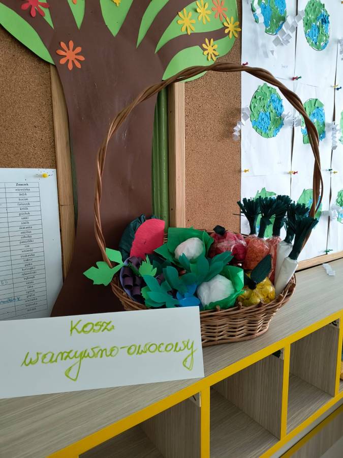 W minionym tygodniu dzieci z grupy "Żabek" i "Żyrafek" rozwijając kreatywność i sprawność manualną wykonały z małą pomocą pań "kosz owocowo - warzywny", który można obecnie podziwiać w przedszkolnej szatni.