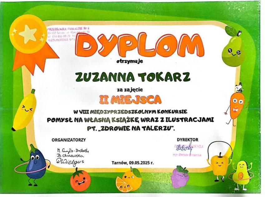 Nasze przedszkolaki uczestniczyły w VIII edycji konkursu " Pomysł na własną książkę wraz z ilustracjami" pt. "Zdrowie na talerzu" organizowanym przez Przedszkole Publiczne Nr 6. W kategorii 3-4 latki II miejsce zajęła Zuzia Tokarz. W kategorii 5-6 latki III miejsce zajęła Elena Rdzak. Wyróżnienie otrzymał Oliwier Jedynak. Wszystkim laureatom gratulujemy.