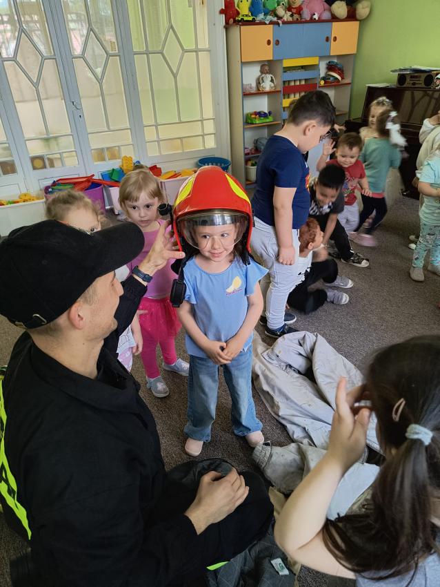 22.05 nasze przedszkole odwiedził strażak z Komendy Miejskiej Państwowej Straży Pożarnej w Tarnowie. Pan strażak z zaangażowaniem i pasją opowiadał o swoim zawodzie, pokazywał dzieciom stroje które strażak ubiera na akcje, opowiadał o sprzęcie jaki jest używany podczas akcji.