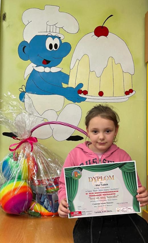 Nasze Przedszkole brało udział w Międzyprzedszkolnym Przeglądzie Teatralnym ,,Snuj się,snuj bajeczko" organizowanym przez Przedszkole Publiczne nr 33 w Tarnowie pod honorowym patronatem Rady Osiedla nr.8 ,,Mościce". Tegoroczne hasło to ,,Bajka łączy pokolenia". Grupa lll ,,Żyrafy" wystąpiła z bajką pt ,,Bajki które znamy i kochamy". Nagrodę za charakterystyczną rolę czarownicy w przedstawieniu otrzymała Maja. Nagrodą jest również wspólne wyjście do Kina Millenium na film pt,, Niesamowite przygody Skarpetek".
