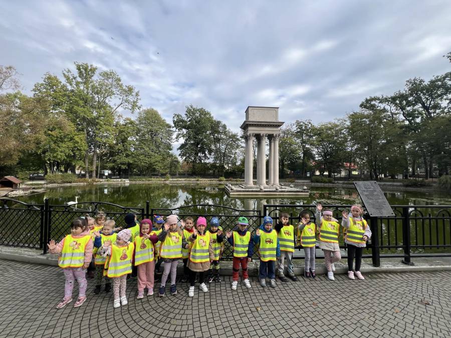 Realizując zadania z programu własnego " Przedszkolak mały patriota i obywatel" dzieci z oddziału II udały się na wycieczkę do Parku Strzeleckiego. Park odkrył przed nami swe piękno. Podziwialiśmy jesienne barwy, rosnące krzewy i drzewa. Bacznie przyglądaliśmy się przyrodzie: korze drzew, liściom, rozmawialiśmy o zwierzętach i ptakach żyjących w parku. Spotkaliśmy nawet wiewiórkę, łabędzie , kaczki. Rozmawialiśmy na temat Mauzoleum gen. Józefa Bema. Najwięcej radości sprawiło dzieciom zbieranie żołędzi i kasztanów, którymi przyozdobiliśmy nasz kącik przyrody. Zadowoleni, z kieszeniami pełnymi żołędzi i kasztanów wróciliśmy do naszego przedszkola.
