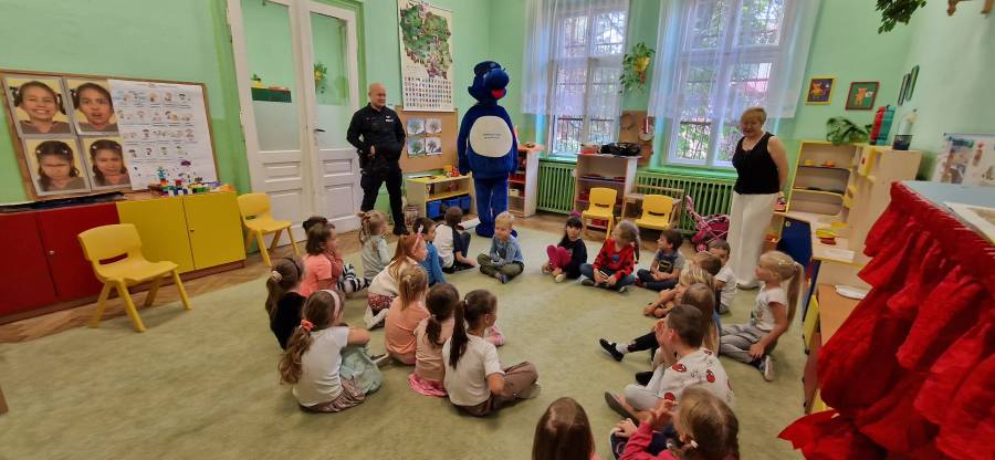 W dniu dzisiejszym 26.09.2023 nasze przedszkole odwiedzili szczególni goście pan policjant i Inspektor Wawelek . Podczas spotkania dzieci przypomniały sobie zasady bezpiecznego poruszania się po drogach, jak reagować w sytuacjach różnych zagrożeń. Utrwaliły numery alarmowe. Policjanci podkreślali , jak ważne dla własnego bezpieczeństwa jest noszenie elementów odblaskowych szczególnie jesienią i zimą. W podziękowaniu za interesujące spotkanie dzieci wręczyły policjantom upominek.