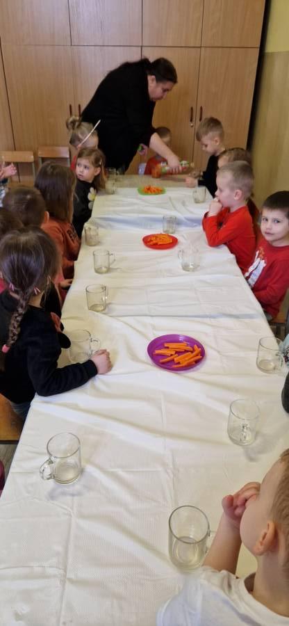 4.04.2023r. W dniu dzisiejszym w oddziale I główną bohaterką była marchewka. Dzieci wraz z Kubusiem oglądały bajkę "Kubuś- Dzień Marchewki" przeliczały, określały wielkość marchewek, uczestniczyły w zabawach muzyczno- ruchowych, degustowały przygotowane przez siebie marchewki, piły pyszny owocowy sok. Wykonaliśmy pracę plastyczne. Głównym celem akcji było promowanie spożywania warzyw.