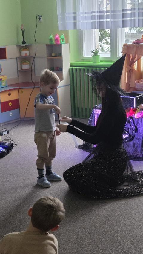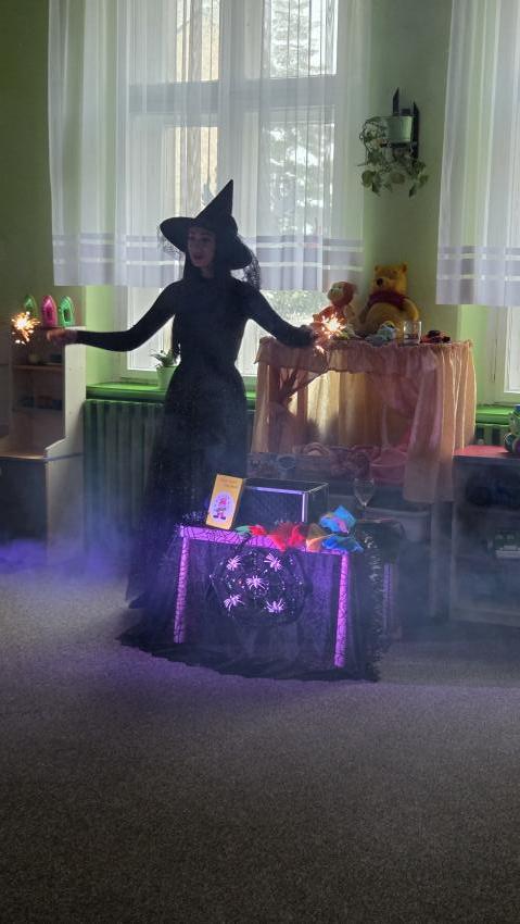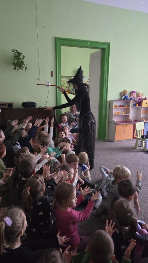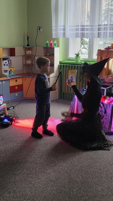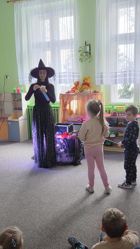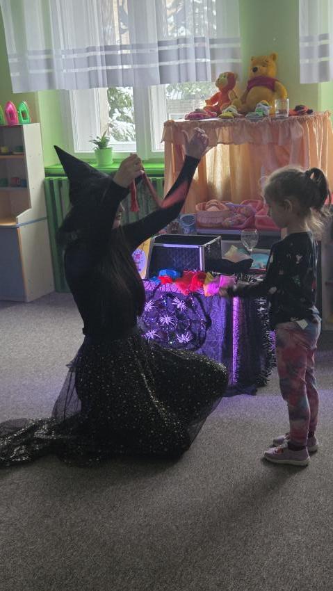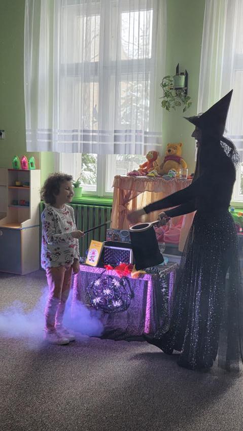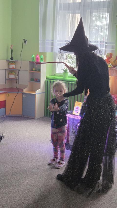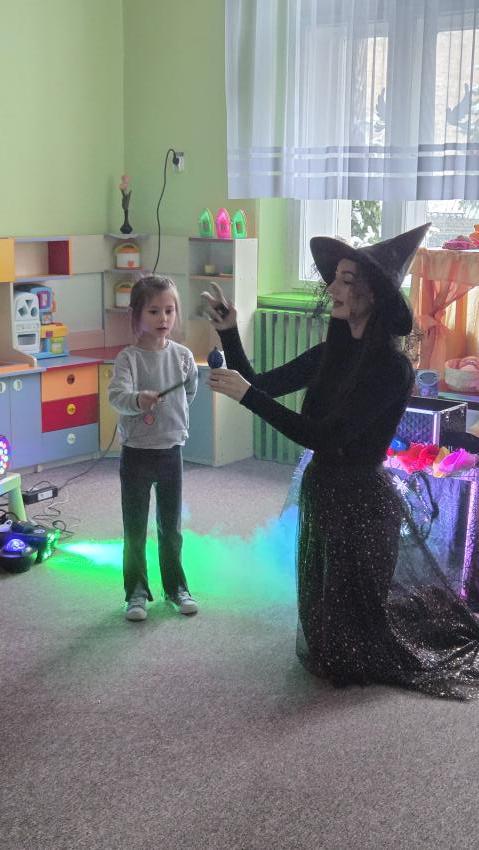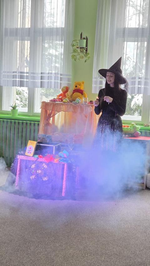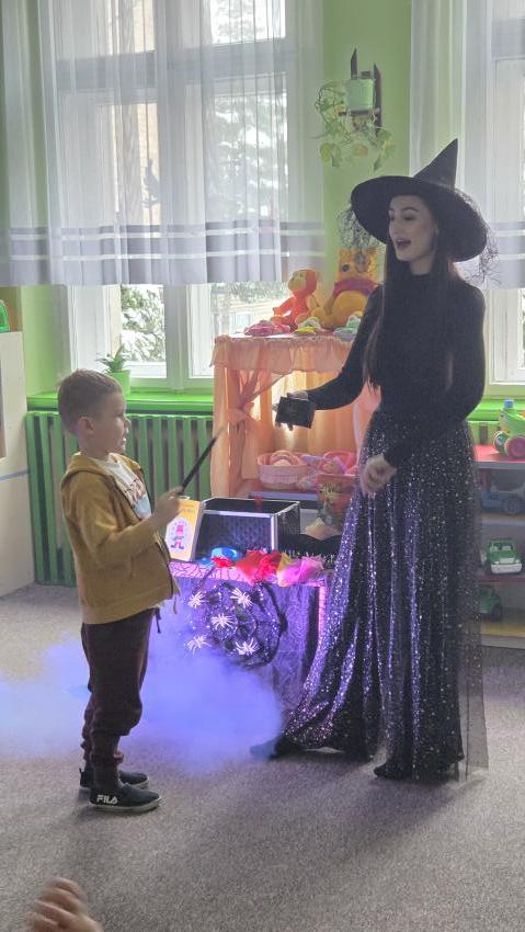 Dnia 21.11.2025 r. do naszego przedszkola przybył tajemniczy gość. Tym gościem okazała się czarodziejka Aleks, która zabrała nas do świata czarów i magii , dzięki temu przedszkolaki miały możliwość nauczyć się tajemniczych zaklęć. Podczas występu nie zabrakło też chętnych i odważnych ochotników, którzy pomagali czarodziejce w jej pokazie i sami czarowali.Wszystkim dzieciom bardzo podobały się niesamowite sztuczki i czary.Wizyta Magika w przedszkolu to wyjątkowe i pełne magii wydarzenie, które z pewnością zostanie w pamięci dzieci na długo.